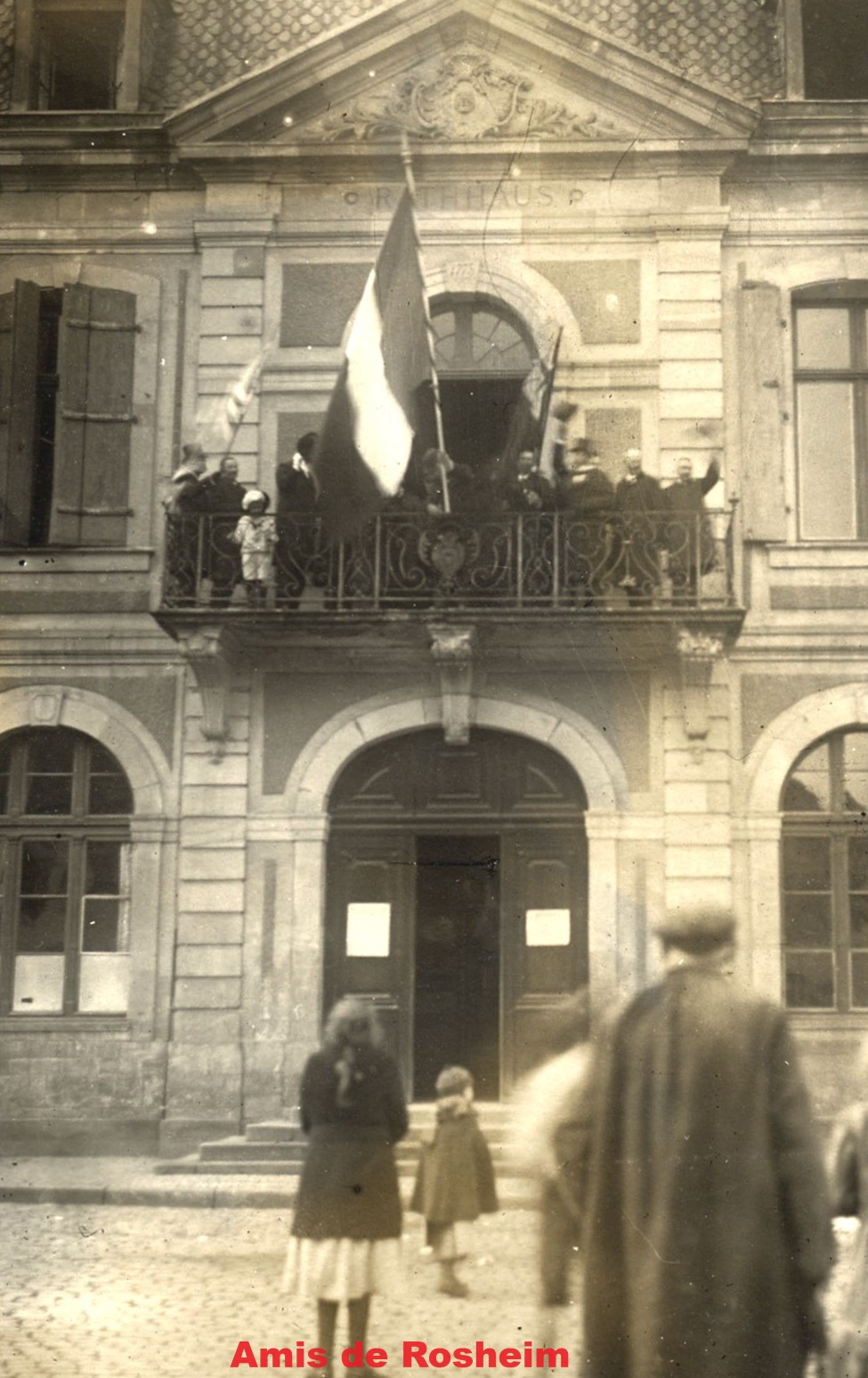 Chronique paroissiale du curé Vierling : « Dans la nuit du 17 au 18 novembre nous eûmes pour la dernière fois à assumer le cantonnement d’Allemands. Ils quitèrent la ville à 10h. C’était lundi. Vers midi on hissa sur la mairie le drapeau français. Le conseil municipal se tenait en costume de fête au balcon, une bonne partie de la population était rassemblée sur la place; tous chantaient la Marseillaise. Quelqu’un (selon certaines source, le maire Joseph Meyer lui-même, mais plus sûrement le docteur Ledoux) jeta les bustes des empereurs Guillaume Ier et Guillaume II du haut du balcon sur le pavé de la place. La ville était merveilleusement décorée de drapeaux tricolores. C’était étonnant de voir avec quelle rapidité les gens avaient pu, en cachette et malgré la pénurie de tissu, fabriquer une telle quantité de drapeaux …