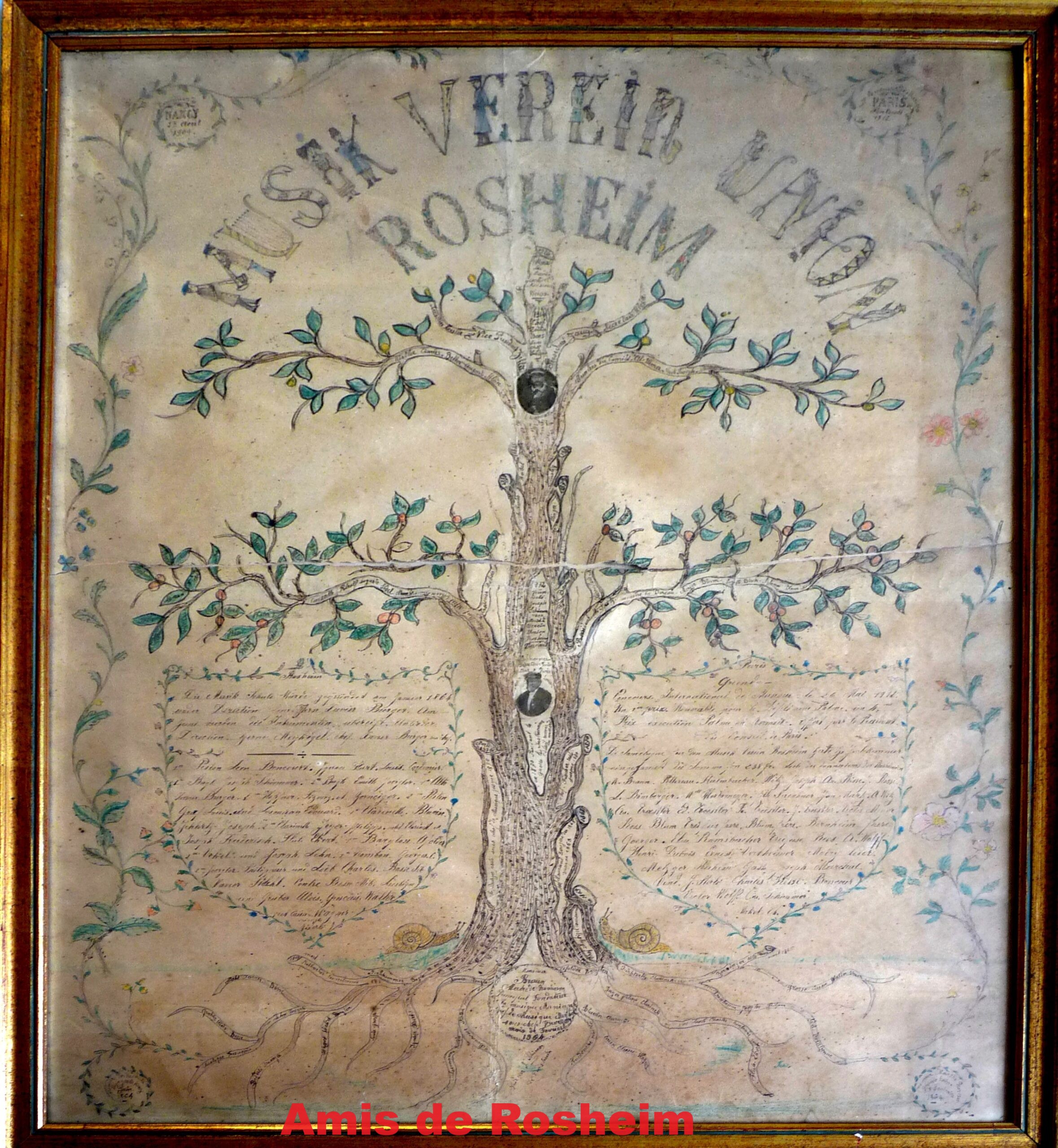 3 – Arbre généalogique de la Musique Union réalisé en 1814 par Joseph Schimmer à l’occasion des 50 ans de la société. Les racines sont constituées des membres de la première équipe de 1864, les branches les noms des membres en 1914, le tronc les chefs successifs ainsi que les maires Braun et Weiss avec une photo de Joseph Schimmer en bas et de Louis Roos en haut. Dans les angles figurent 4 faits marquants des 50 premières années.