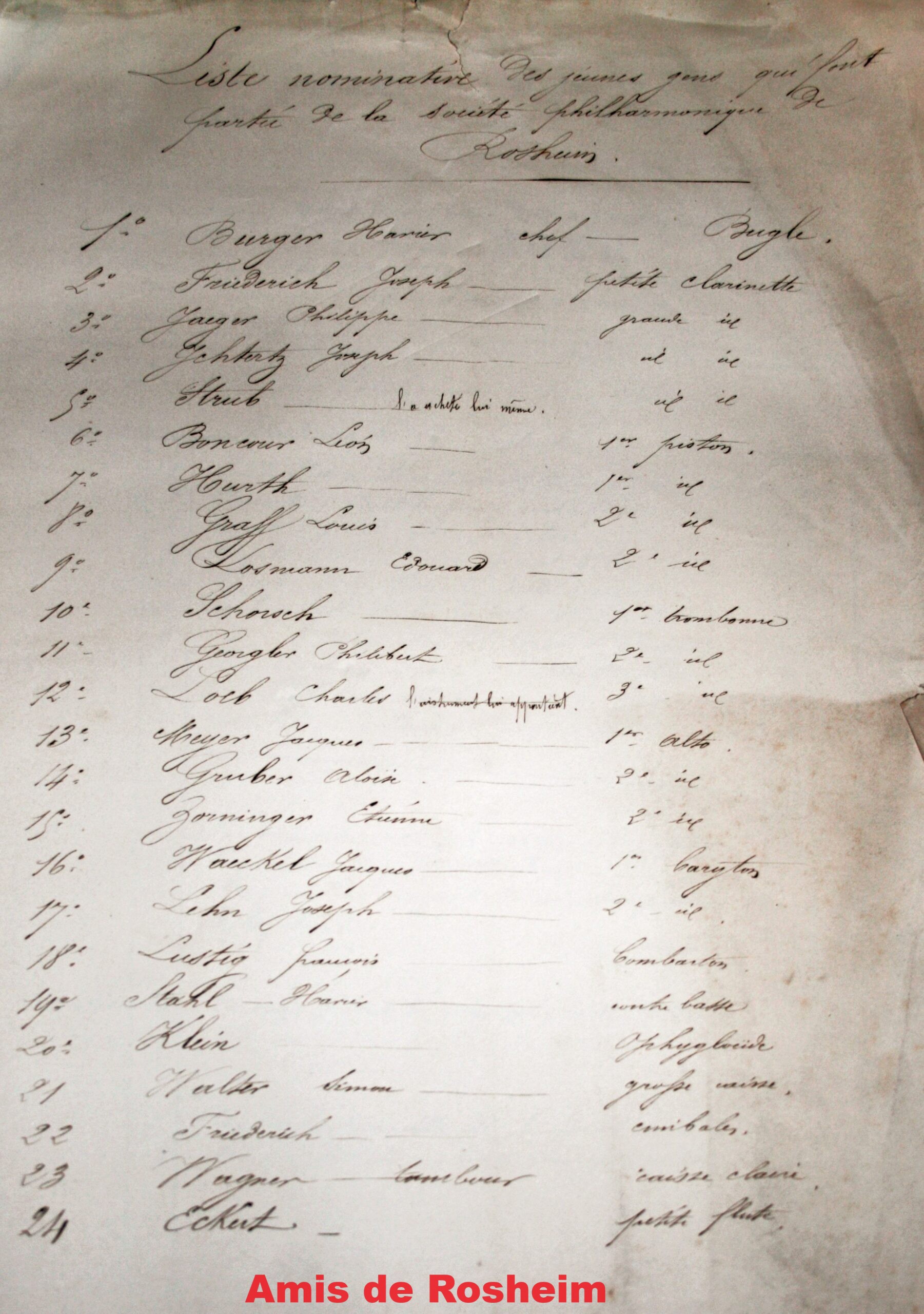 1 – Les 24 pionniers en 1864 leurs noms figurent sur  la « liste nominative des jeunes gens qui font partie de la société philarmonique de Rosheim »,