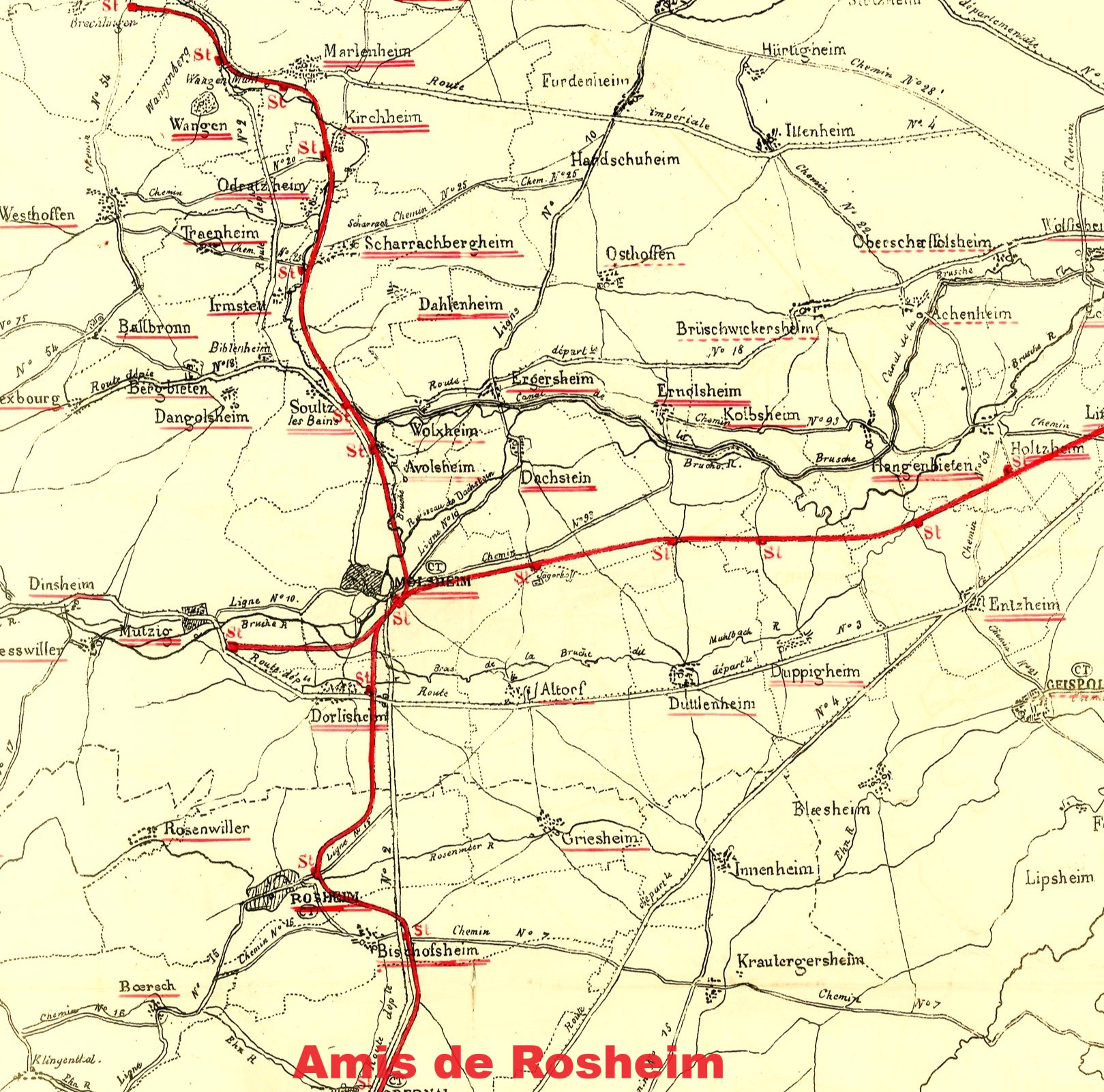 5 : Le tracé de la ligne du chemin de fer vicinal 1bis : on voit bien le passage par Rosheim-centre, avant de rejoindre Bischoffsheim.