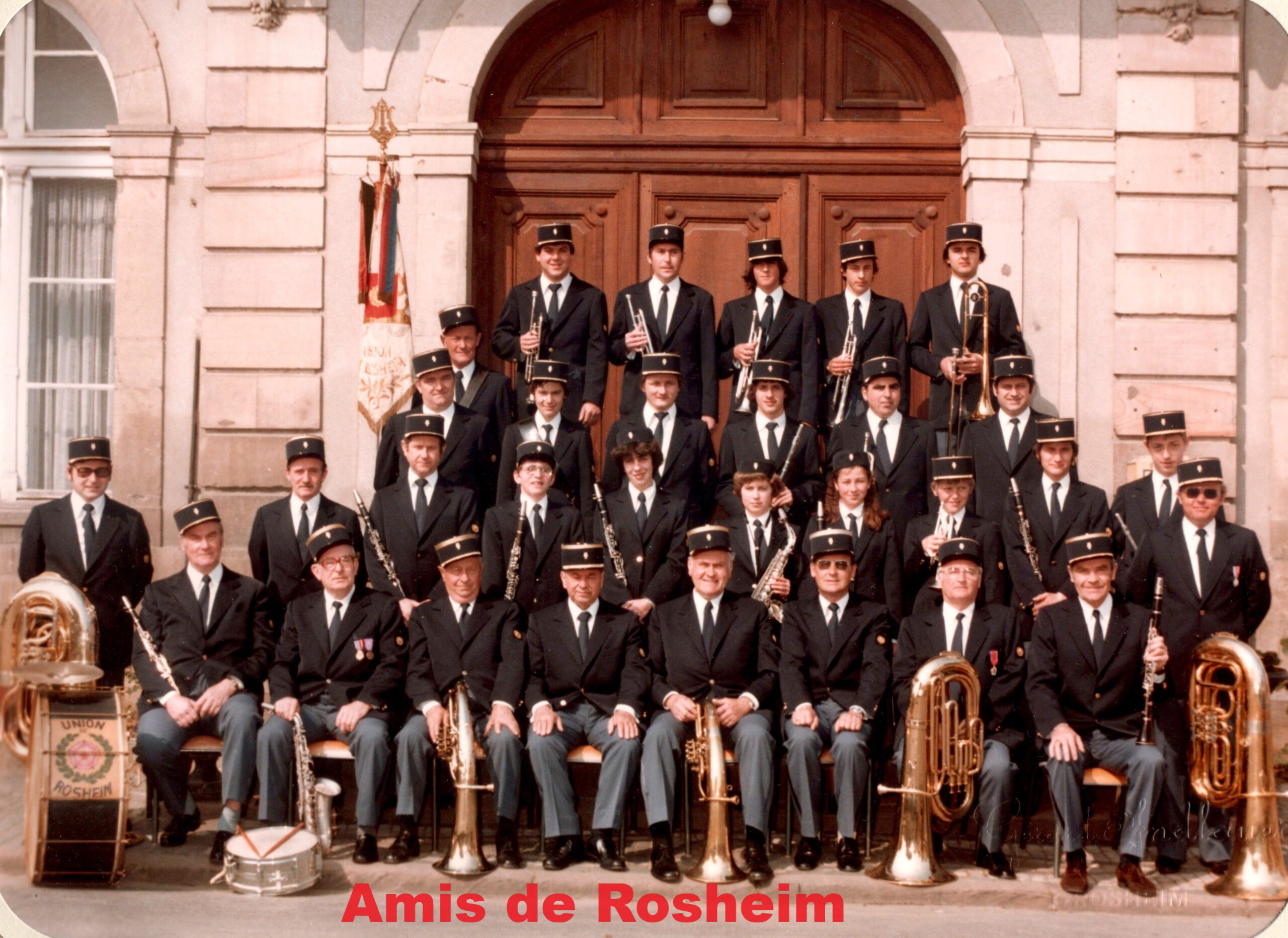 5 – Le 25 mai 1980, les musiciens prennent la pose devant la mairie avec leurs nouveaux uniformes. Au 4ème rang : André Littel, Claude Guth, Daniel Modry, Roland Grauffel, Joseph Ober, Jean-Pierre W elker. Au 3ème rang : Gérard Schaeffer, Patrick Jost, Bertrand Fliegans, Patrick Wiss, Charles Halter, Bernard Rosfelder. Au 2ème rang : Gérard Jost (fils), Charles Fliegans, Gérard Kordian, Jean-Marc Dandine, Chantal Frey, Marie-Christine Ober, Marie-Pierre Ober, Joseph Spiesser, Jean-Charles Joerger, Jean-Luc Herr. Au 1er rang : Charles Kessler, Victor Roos, Paul Beller, Gérard Jost (père), Xavier Kessler, Adolphe Grauffel,Charles Merck, Francis Farges, Marcel Modry.
