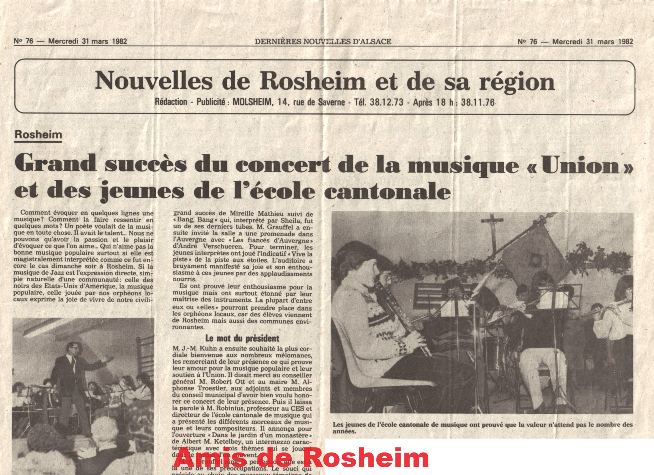 6 – Article des DNA relatant le concert du 28 mars 1982 commun à la Musique « Union » et à l’école cantonale de musique.