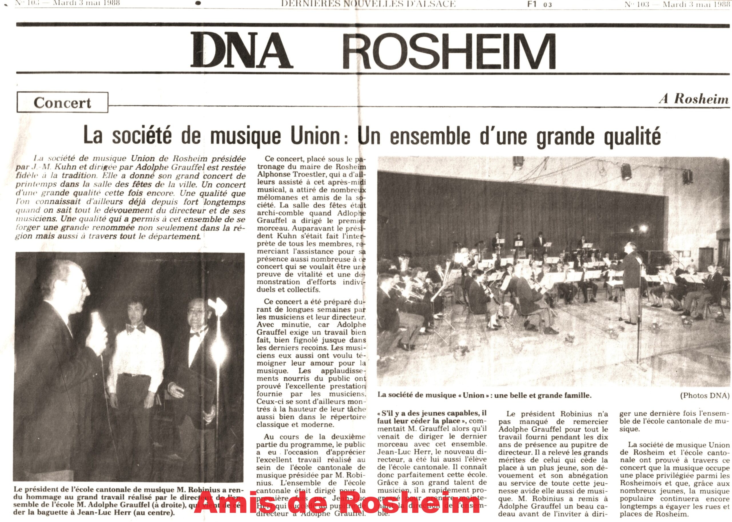 Le concert annuel, donné le 23 avril 1989 dans la salle des fêtes revêtira une importance particulière. 1989 est l’année du 125ème anniversaire et celle des 25 années de direction du chef Adolphe Grauffel qui dirige son dernier concert. Il a décidé de passer la main à Jean-Luc Herr.