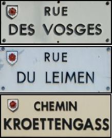 Juste après la rue des Vosges, et toujours à gauche, la rue du Leimen dont l’origine du nom vient certainement de la nature du terrain argileux à cet endroit (Lehm = glaise en allemand).
