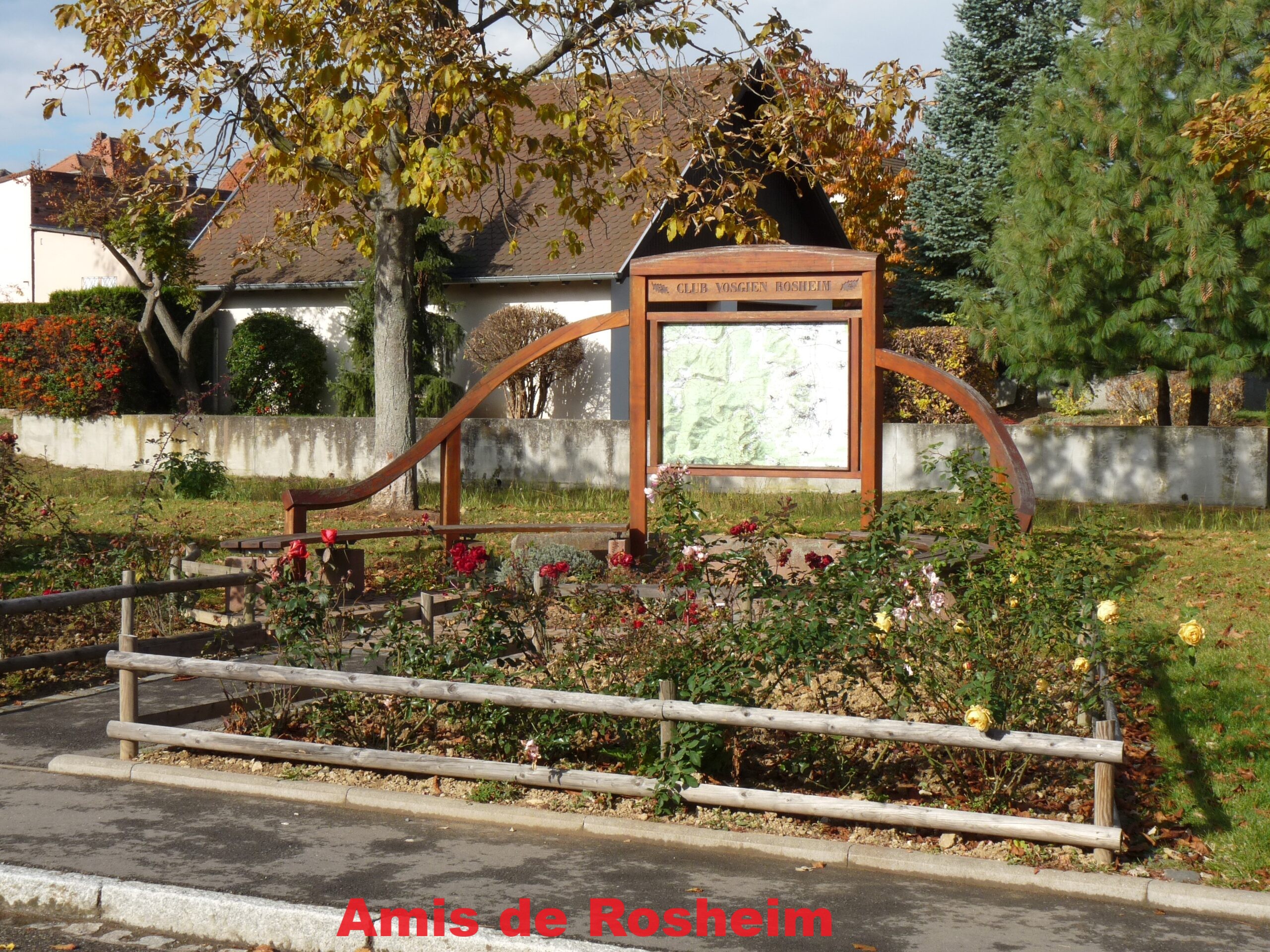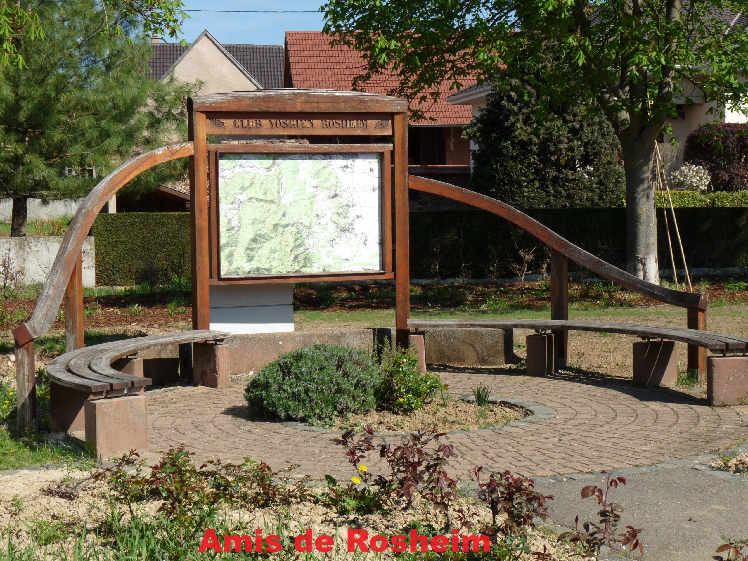 4-5 – Square du Club Vosgien, réalisé à l’occasion du centenaire de l’association de Rosheim réactivée en 1972 sous l’impulsion de l’instituteur Bernard Soller. Une carte avec les itinéraires de randonnées est installée sur un parvis en grès des Vosges provenant de l’ancien escalier de l’Eglise Saints-Pierre-et-Paul.