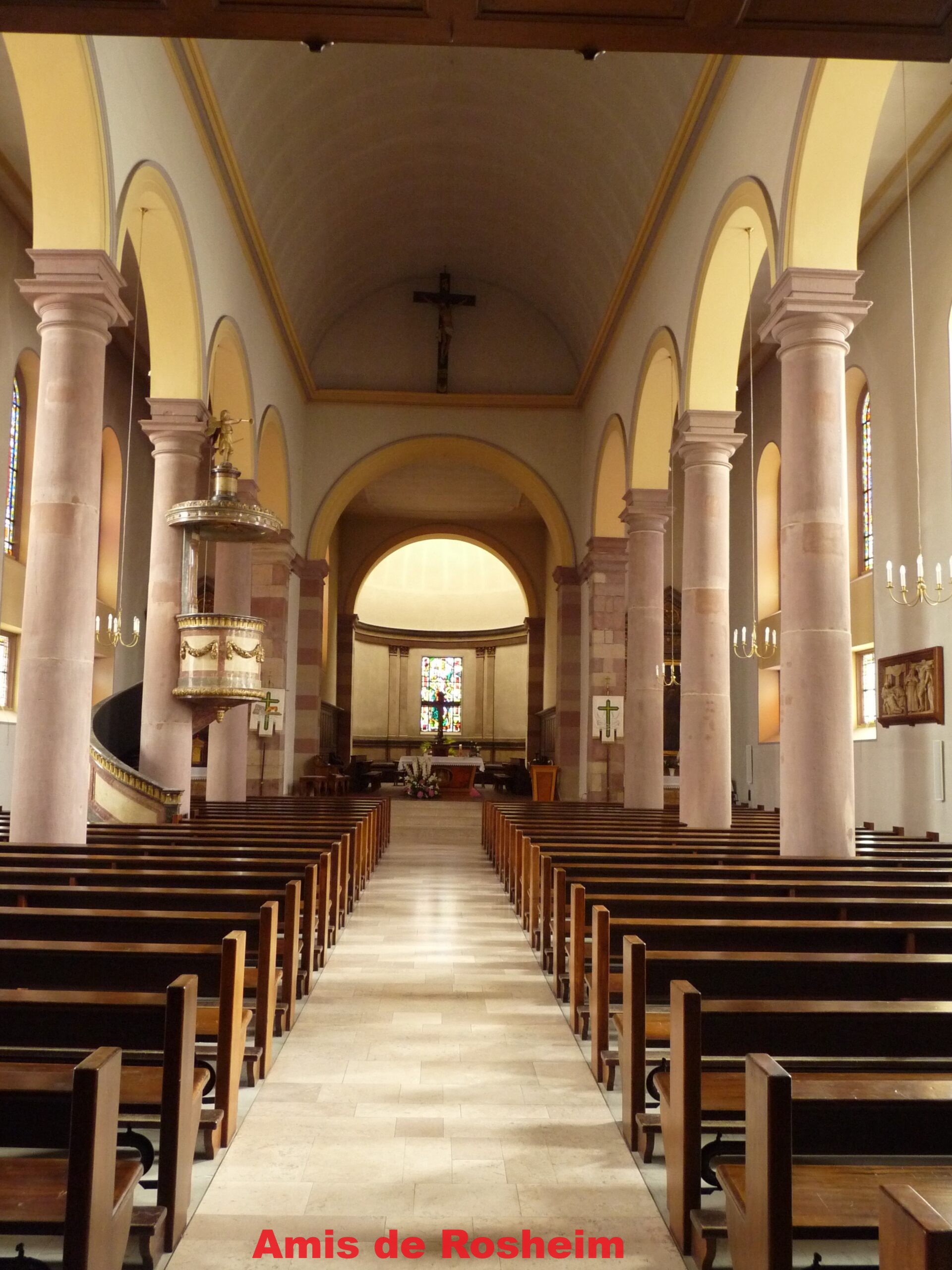 L’intérieur de l’église Sainte-Aurélie reconstruite en 1762 et modifiée au XIXe siècle, l’église présente trois vaisseaux de hauteurs presque égales; elle fait partie des églises-halles. La chaire en bois est recouverte de stuc.