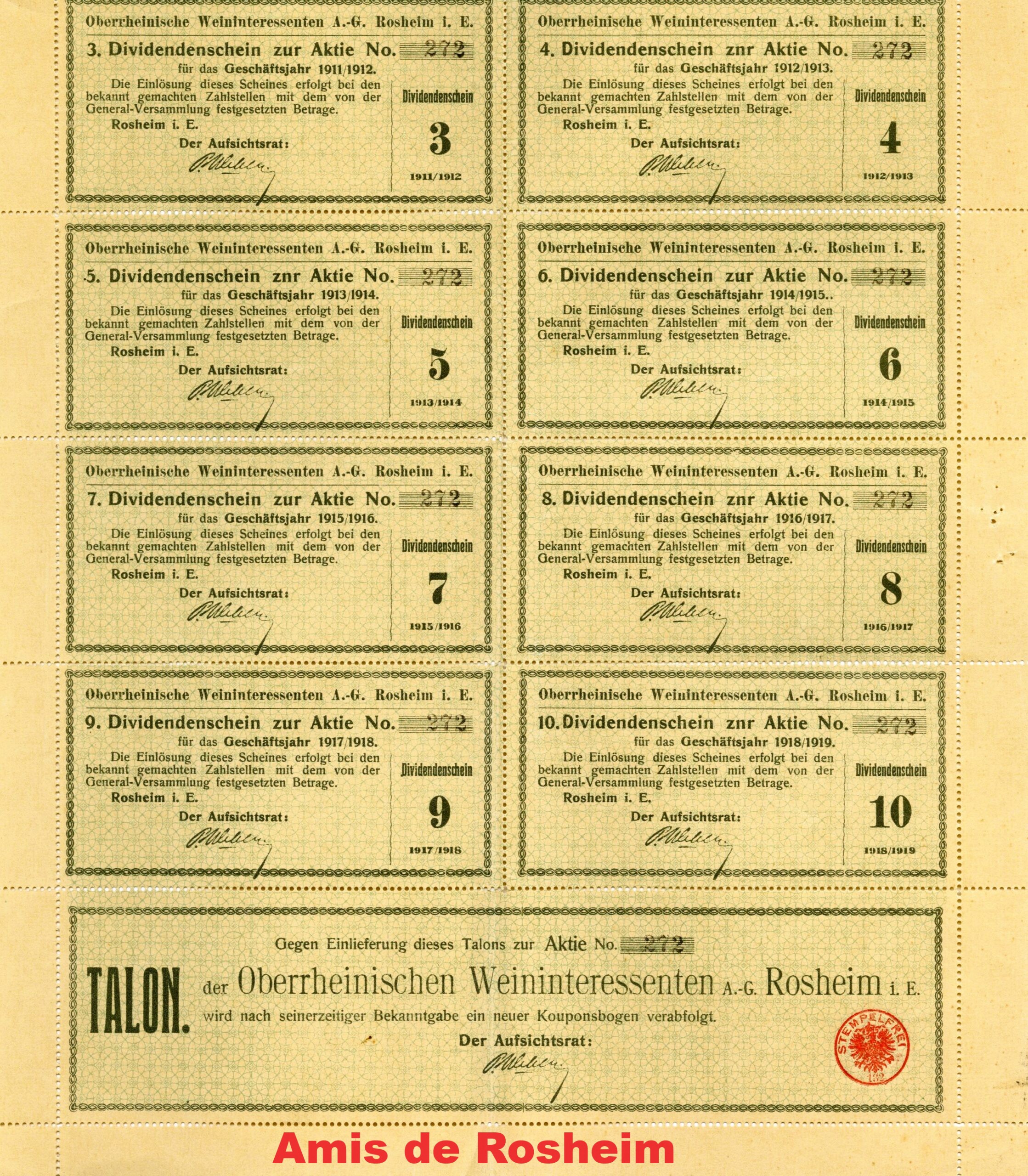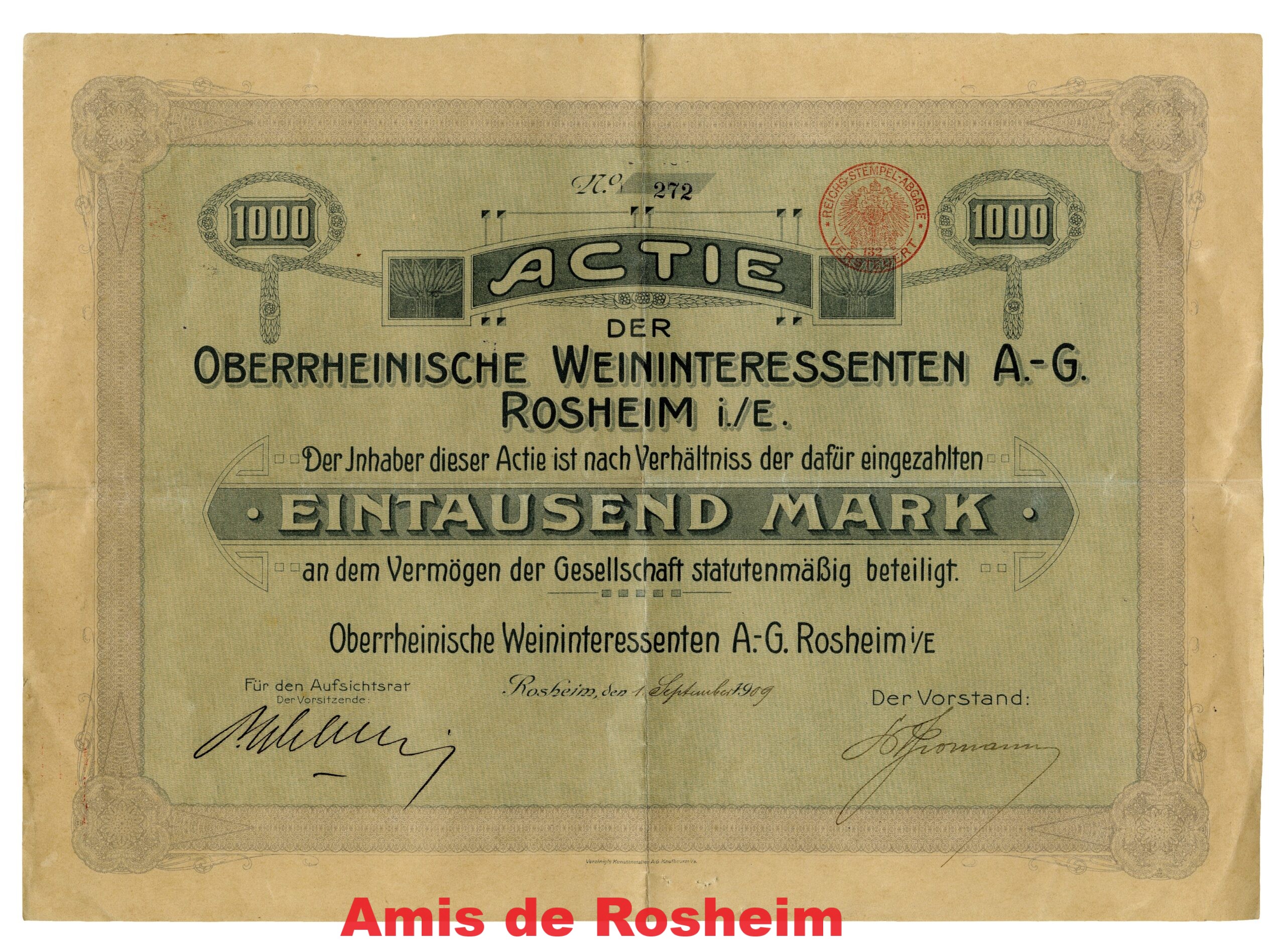 En 1909, la construction d’une cave d’achat et de stockage de vin de dimensions spectaculaires surprend et suscite une certaine opposition des habitants de Rosheim. La cave est constituée par une société par action fondée par 2 grands négociants en vins et spiritueux de Strasbourg, qui profitent de la position de Rosheim au cœur d’une grande région viticole et de son accès direct au réseau ferré. La cave « Oberrheinischer Weininteressenten AG Rosheim » est installée dans la rue du Lion près de la porte du Lion à quelques mètres de la gare de Rosheim-Stadt (Rosheim-Ville).