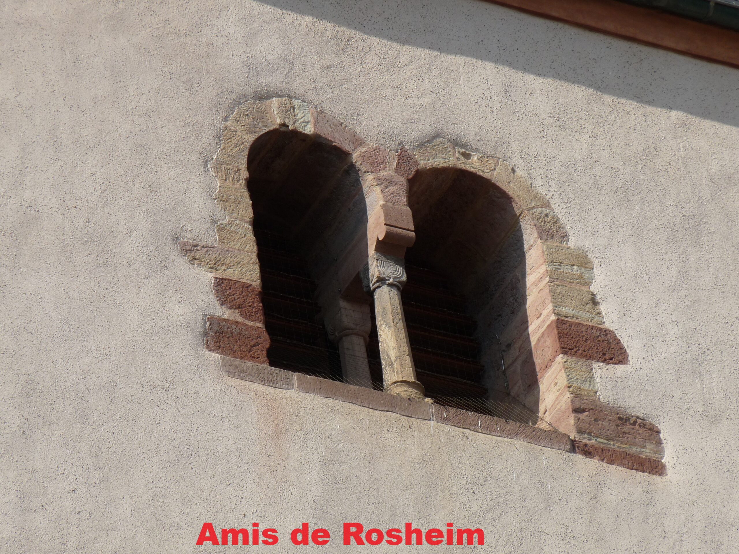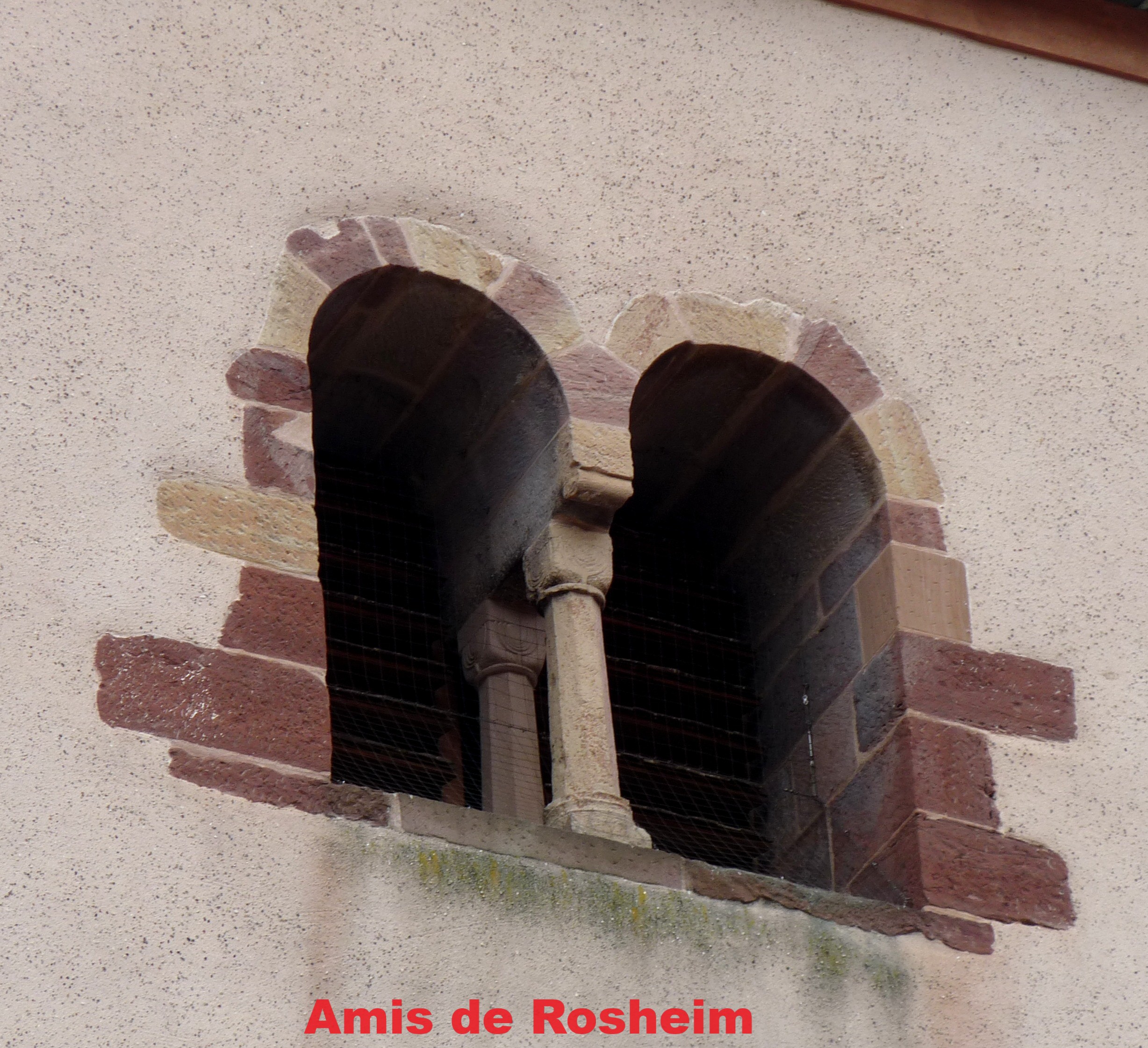 7-8 : Au dernier étage de la tour s’ouvrent des baies géminées (à l’exception du mur sud) dont les pleins cintres retombent sur un tailloir droit médian que supportent deux colonnettes, soit rondes, soit octogonales, disposées en profondeur et possédant un chapiteau cubique.