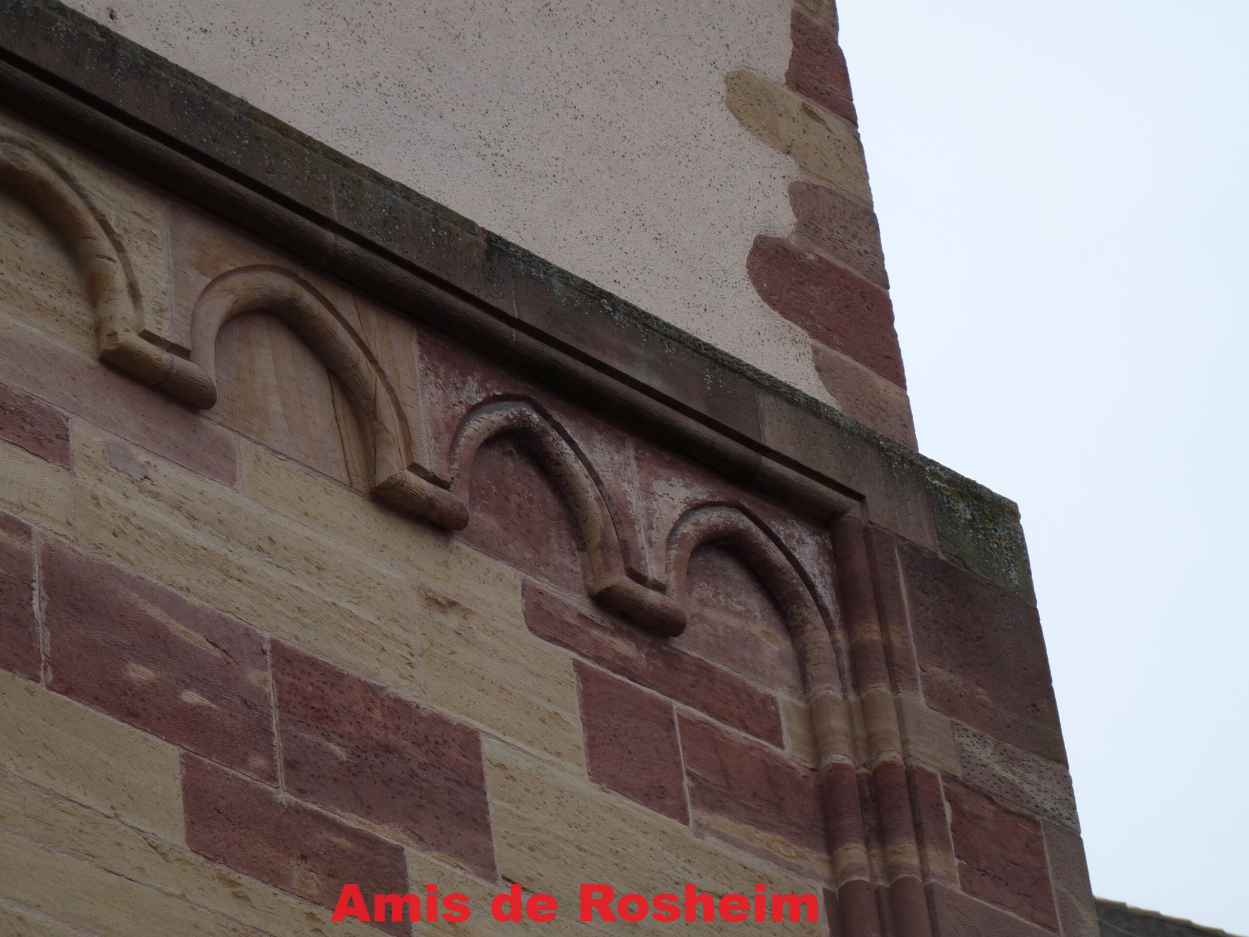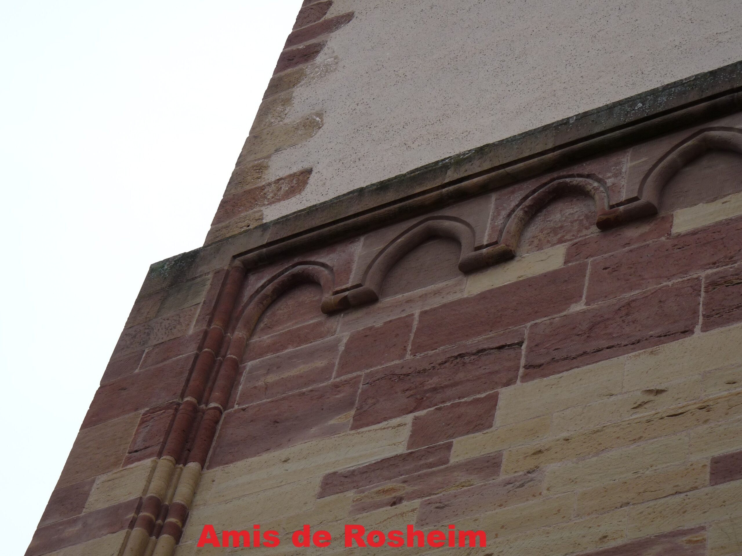 4-5 : Le rez-de-chaussée est couronné d’arcatures en arc brisé, à raison de 10 par face, dont la mouluration se prolonge le long des lésènes d’angle.