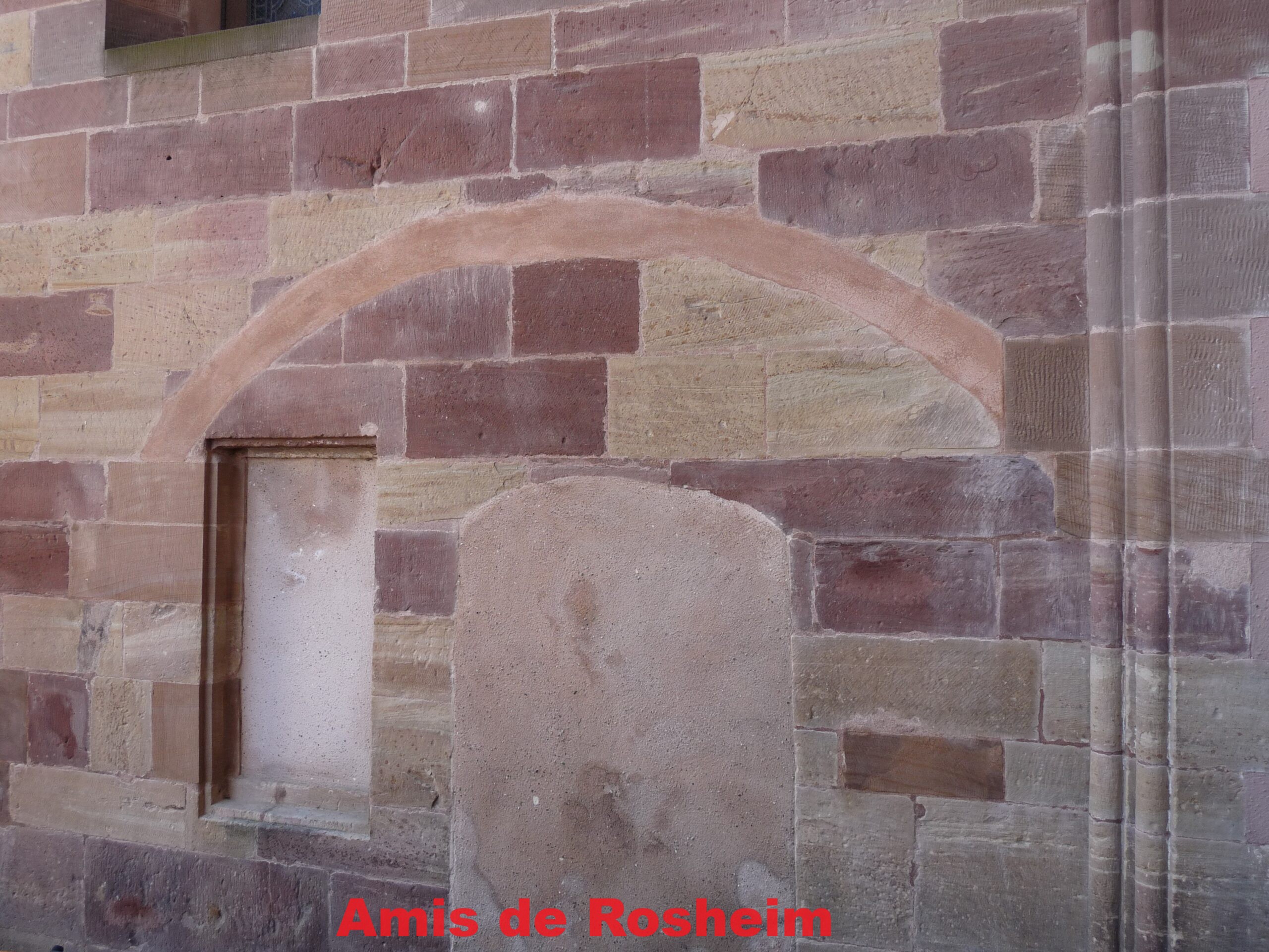 4 – Au bas de la face nord de la tour, les traces d’une ancienne porte et d’une ancienne fenêtre murées. Au fond de la place, contre le mur de la tour se dressait une croix transférée par la suite devant la chapelle de la route de Bœrsch.
