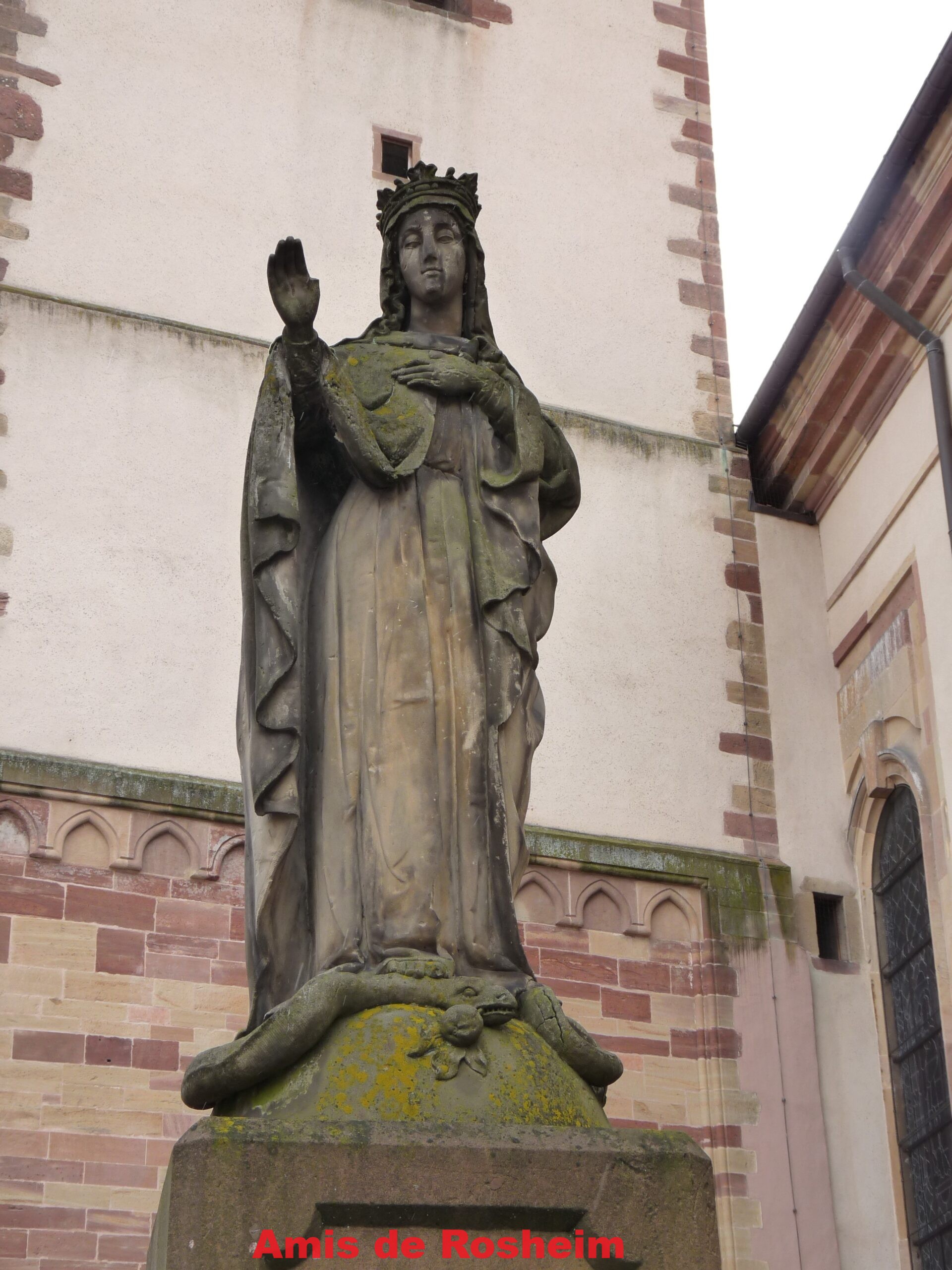 1 – Au milieu de la place Saint-Etienne, se dresse une statue en grès de la Vierge datée de 1854, oeuvre de Johan Martin Feuerstein, sculpteur à Barr. Elle fut érigée en mémoire de la proclamation du dogme de l’Immaculée Conception en 1854 sur l’initiative du curé Jean-Baptiste Raess, frère aîné de l’évêque de Strasbourg André Raess.