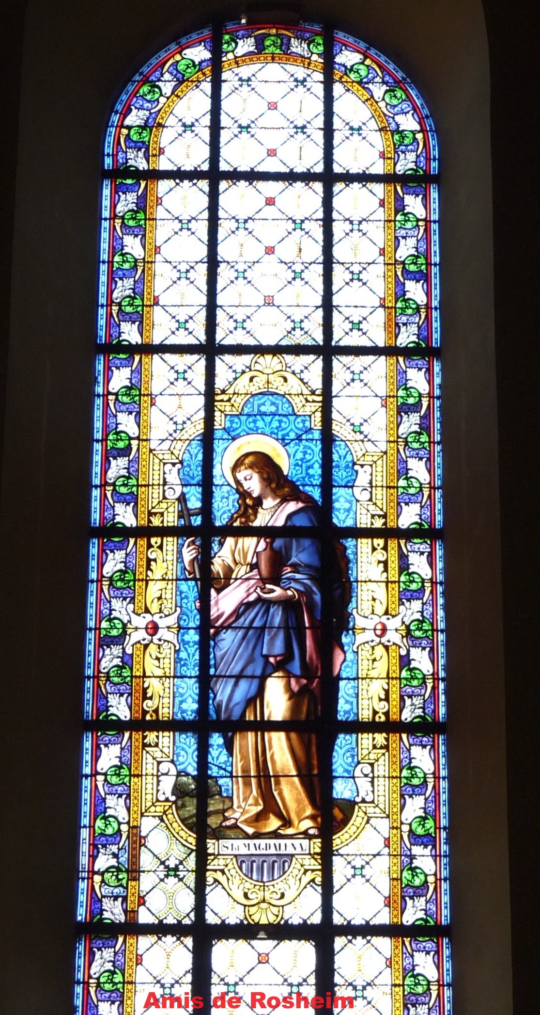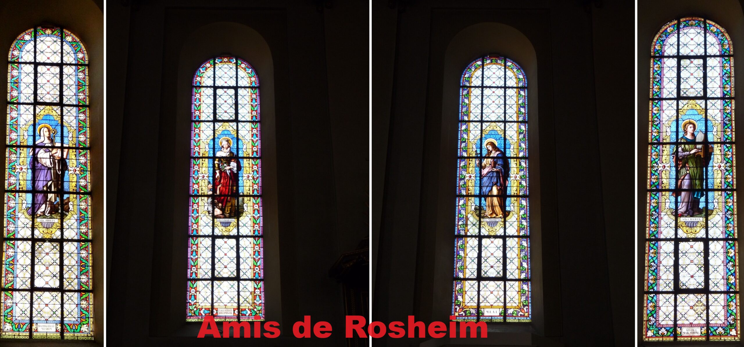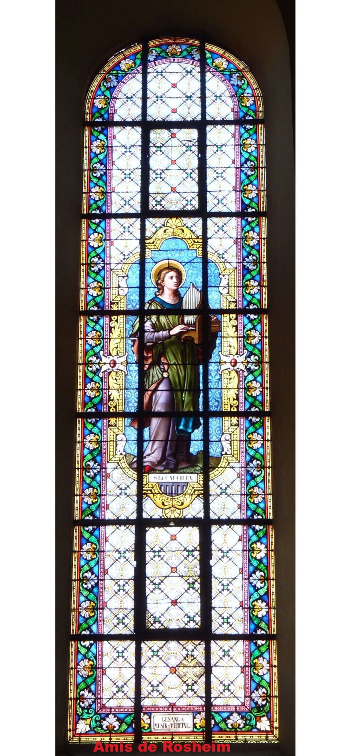 2 – Les vitraux côté gauche, les saints représentés ne sont que des femmes : sainte Odile, sainte Elisabeth, sainte Madeleine, sainte Cécile. Autrefois, jusque dans les années 1960, les femmes occupaient la rangée gauche pendant les offices et les hommes la rangée de droite.