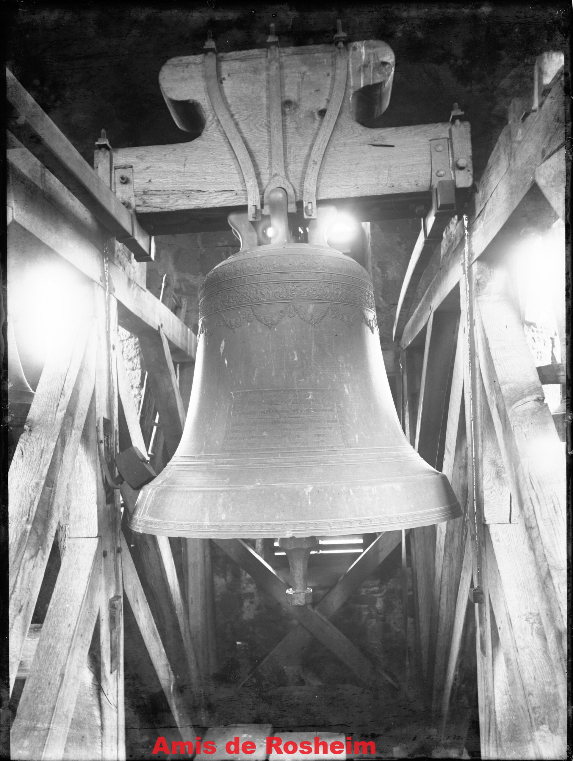 Le bourdon : En 1843, trois nouvelles cloches avaient été mises en place par l’atelier Kress de Colmar. Lors de la guerre de 1914-1918, les deux plus petites furent déposées et seul le bourdon est encore en place. C’est peut-être la difficulté de démontage qui a fait reculer les autorités, ou alors les édiles ont su négocier pour garder une cloche. Le bourdon est vraiment très important, on se demande même comment il a pu être hissé et mis en place dans le clocher. Il porte le nom de Suzanne et sonne en Do.