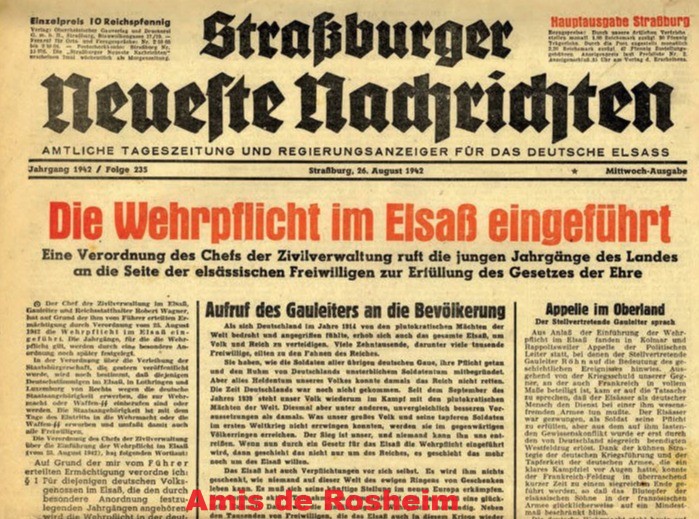 Le 25 août 1942, le service militaire devient également obligatoire pour les Alsaciens et les Mosellans, les jeunes hommes doivent entrer dans la Wehrmacht, voire dans les Waffen SS.