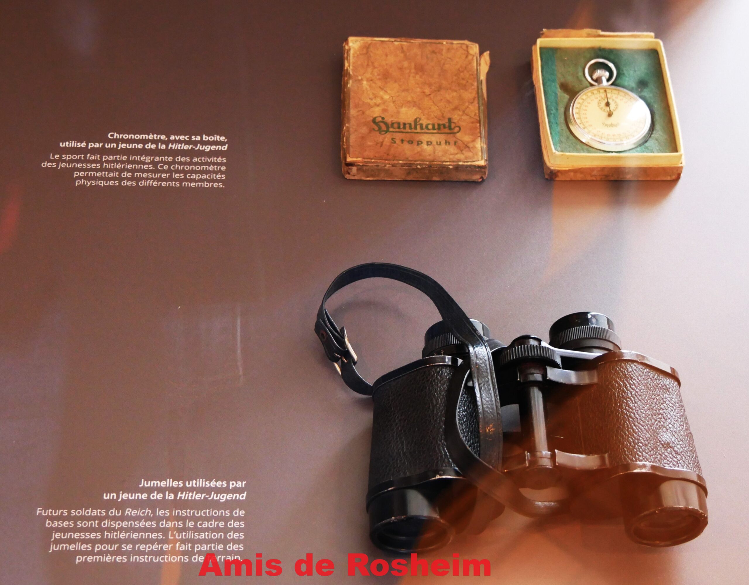 6 – Le sport fait partie intégrante des activités de la Hitler- Jugend, le chronomètre permet de mesurer les capacités physiques. Les jumelles pour apprendre au futurs soldats du Reich à se repérer sur le terrain.
