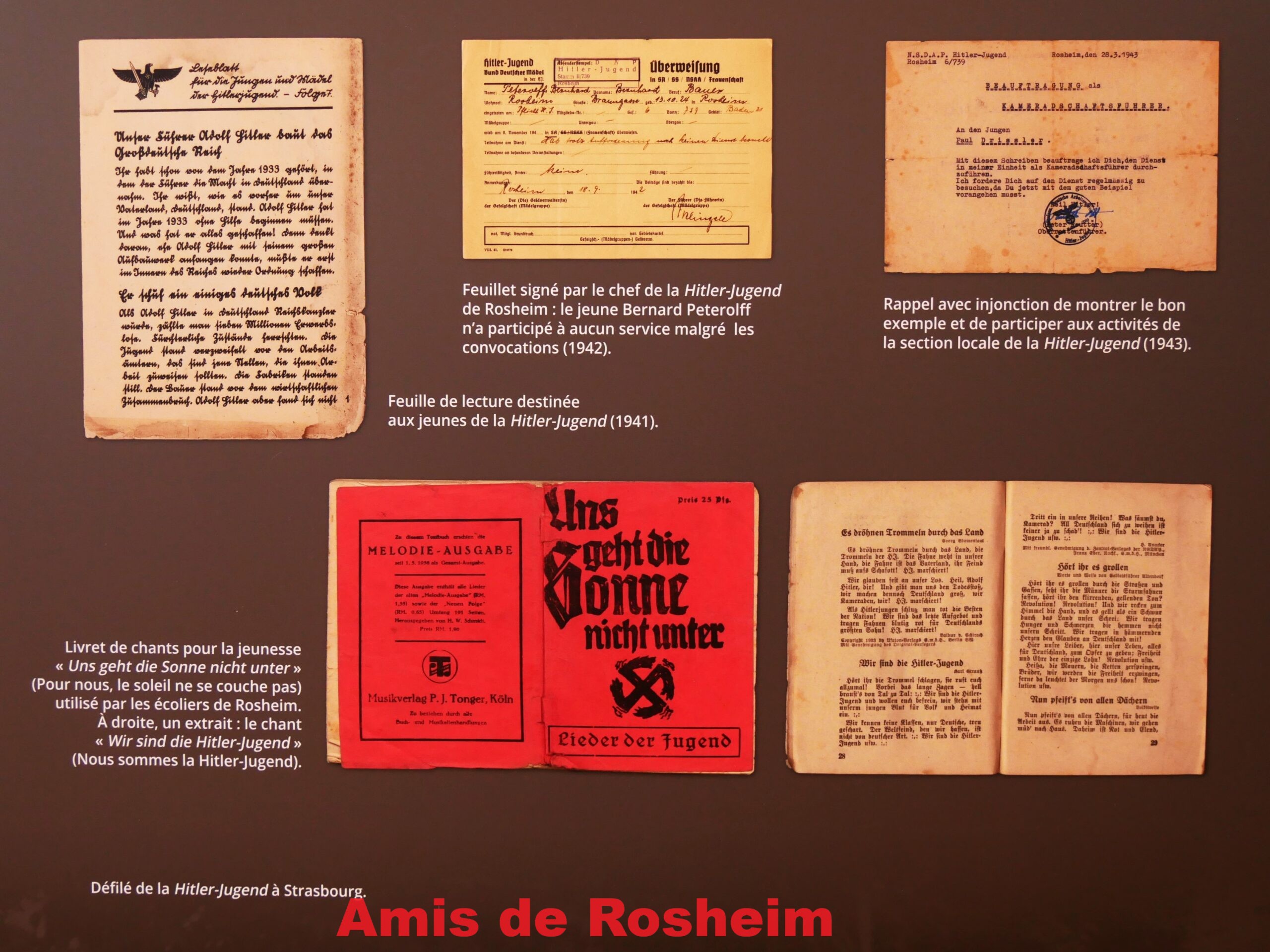 4 – Rendues obligatoires en Alsace en 1942, les jeunesses hitlériennes n’ont jamais caché leurs buts : éduquer les jeunes Allemands et Alsaciens et les écarter de toutes autres influences (de l’Église, mais surtout celle des parents). Lorsqu’il n’y a pas école, c’est la Hitler-Jugend qui rythme le temps libre des enfants, et ceux qui n’y participent pas se font rappeler à l’ordre.