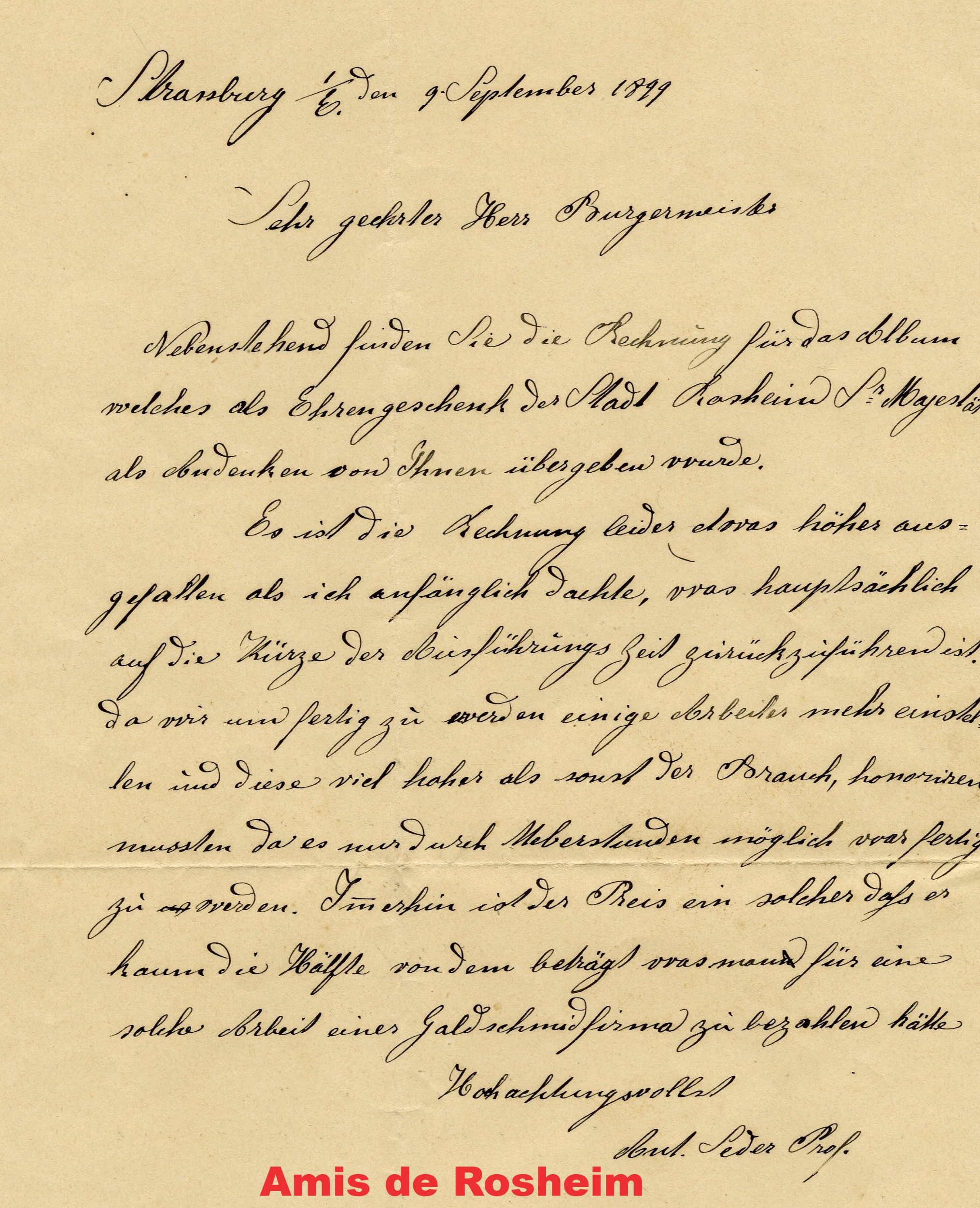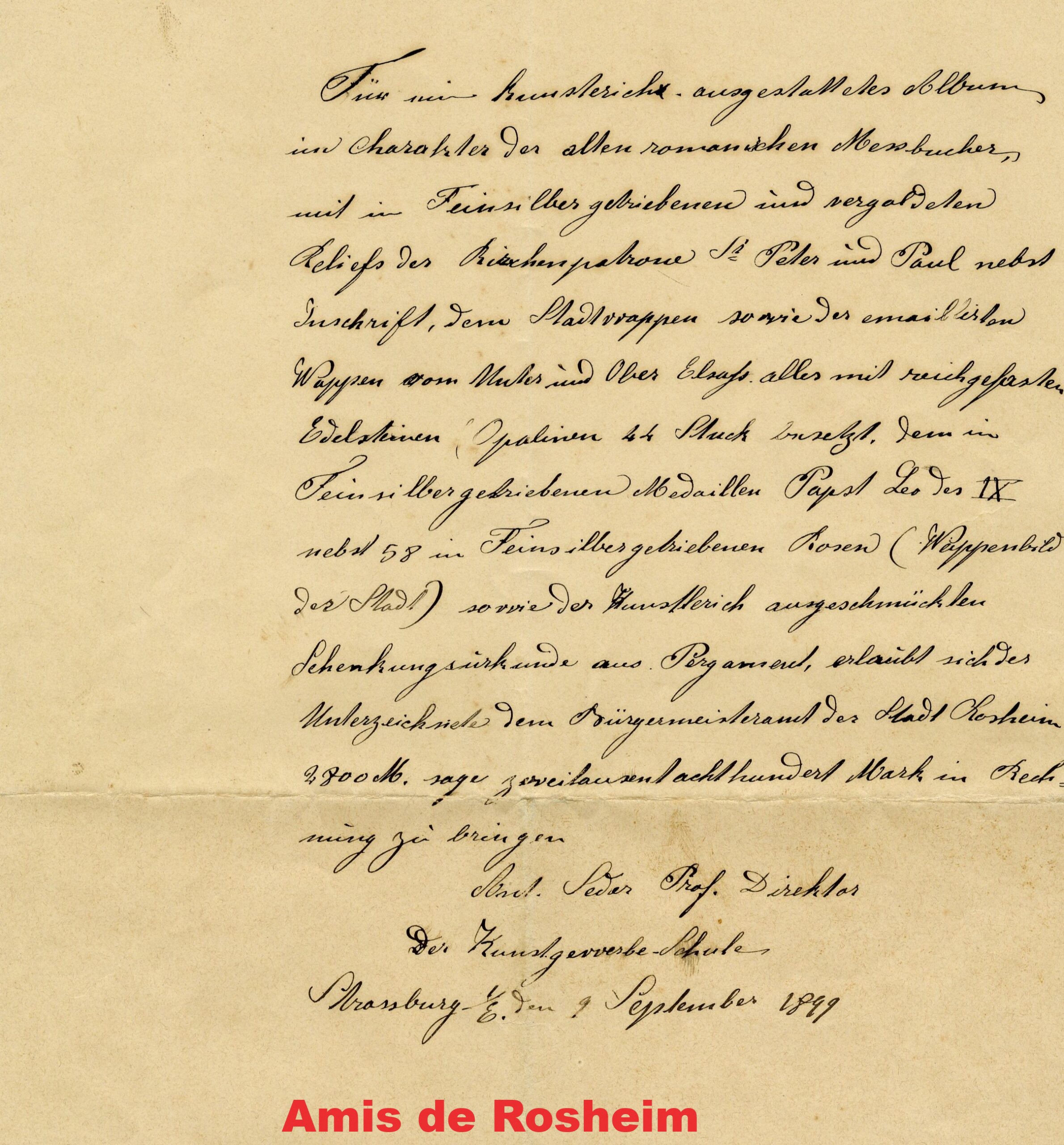 Le maire eut l’honneur de remettre solennellement l’album à l’Empereur le 5 septembre 1899. Guillaume II eut la gracieuse attention de déposer ce chef-d’œuvre à Rosheim où le public put l’admirer durant un mois.
