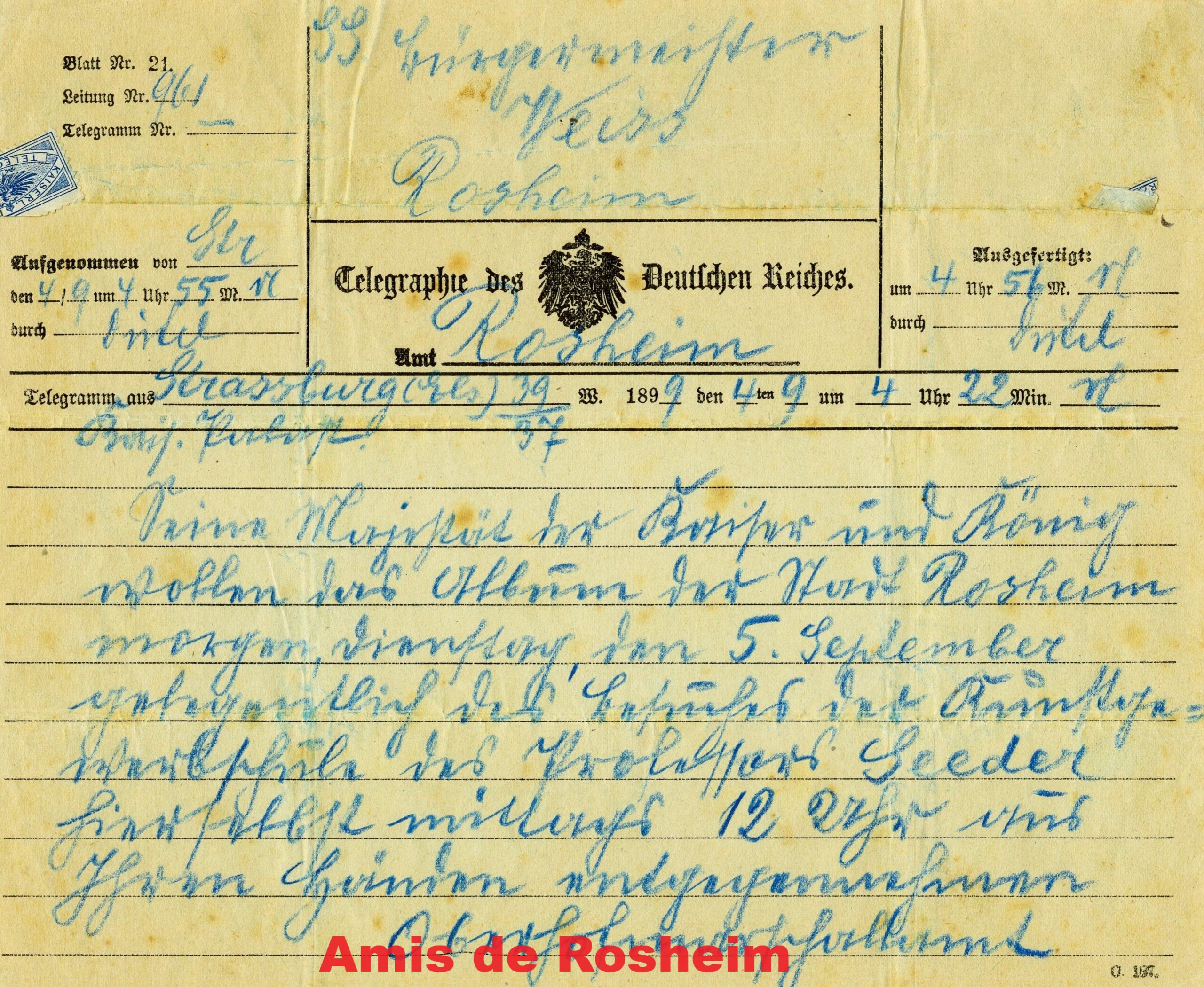6 : Télégramme officiel invitant le Maire Xavier Weiss à remettre l’album souvenir à l’empereur Guillaume II le 5 septembre 1899 à la Kunstgewerbe Schule de Strasbourg.