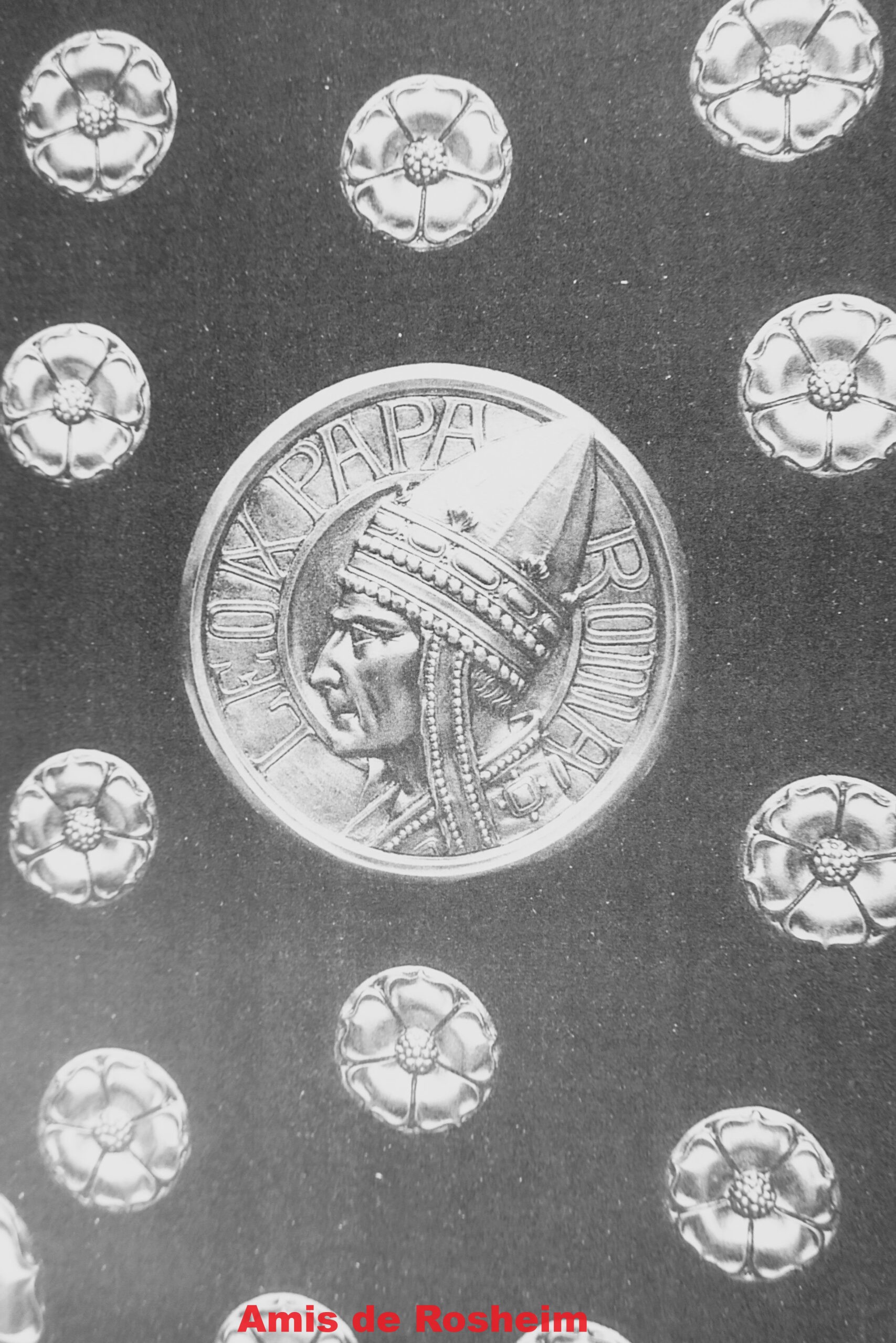 La reliure a été réalisée à l’image des anciens missels romains : une couverture en argent et or repoussé qui représente Saint Pierre et Saint Paul, les armoiries de la Ville, celles de la Basse et de la Haute Alsace enchâssées dans des pierres précieuses et de l’opaline. Au verso un médaillon argenté du pape Léon IX et, sur le pourtour, 58 roses incrustées en argent qui rappellent les armes de la Ville.