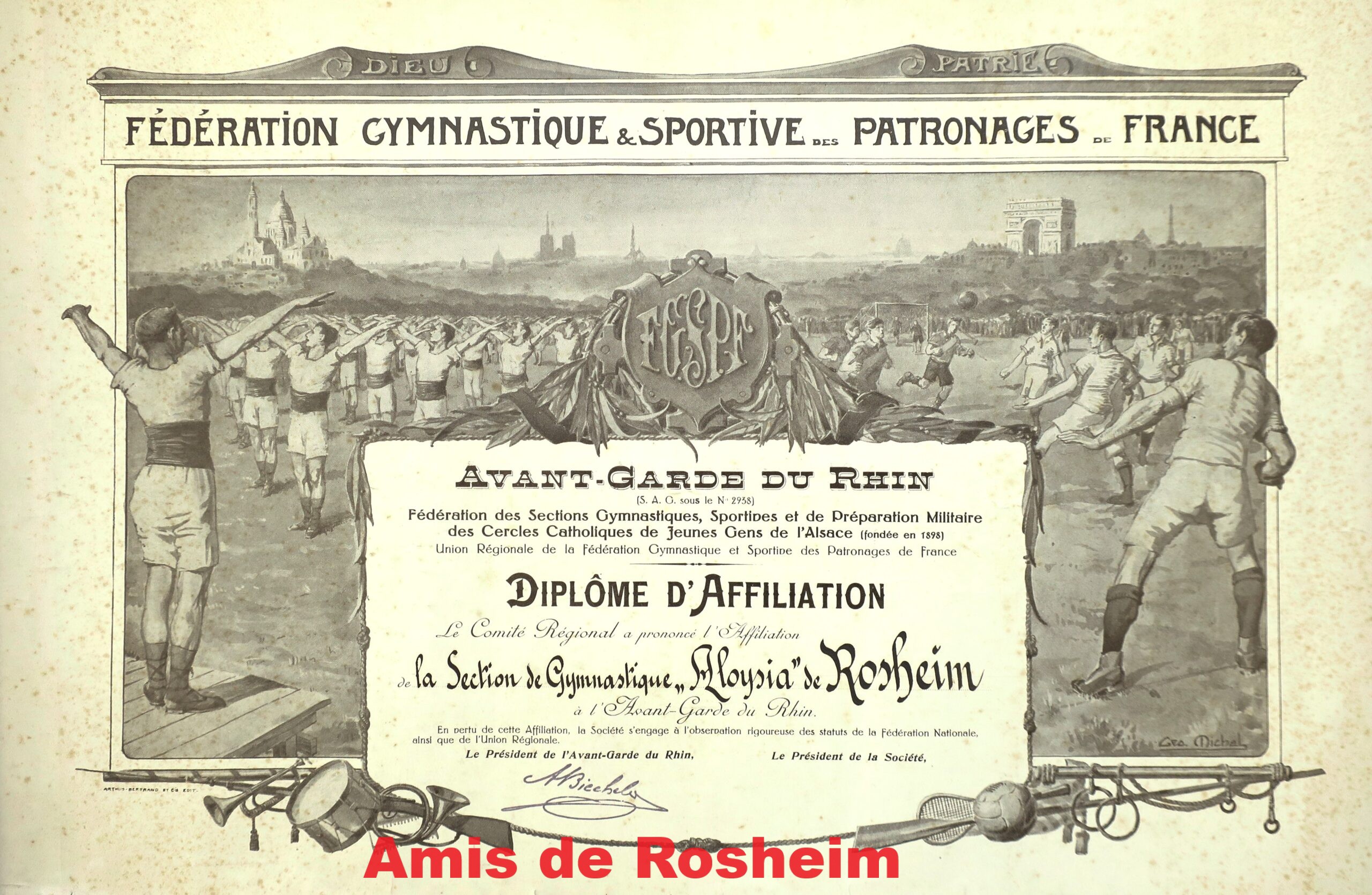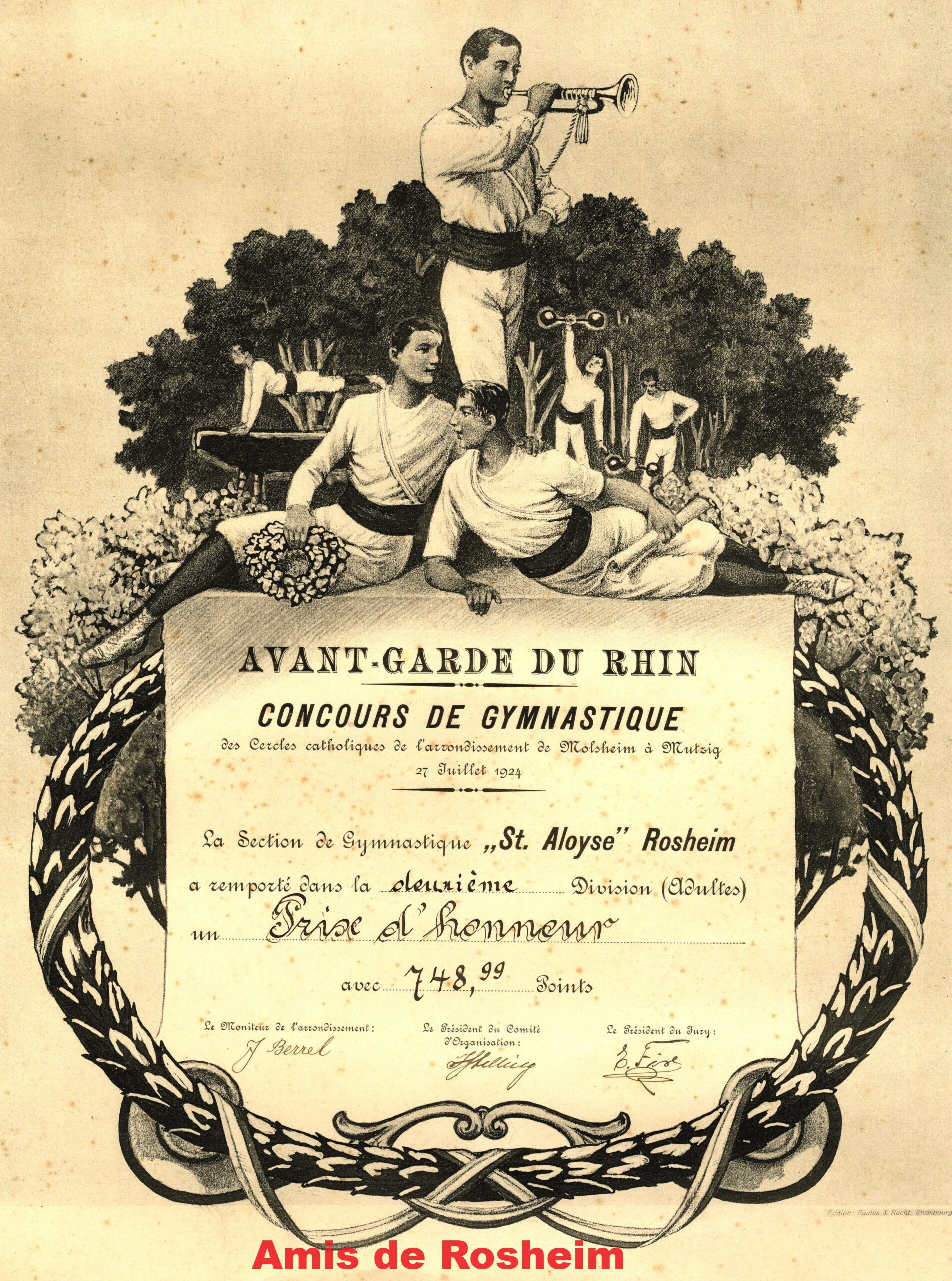 6 – La section de Gymnastique a obtenu ce diplôme pour son Prix d’honneur obtenu lors du Concours de gymnastique des Cercles catholiques de l’arrondissement de Molsheim, organisé le 27 juillet 1924 à Mutzig.