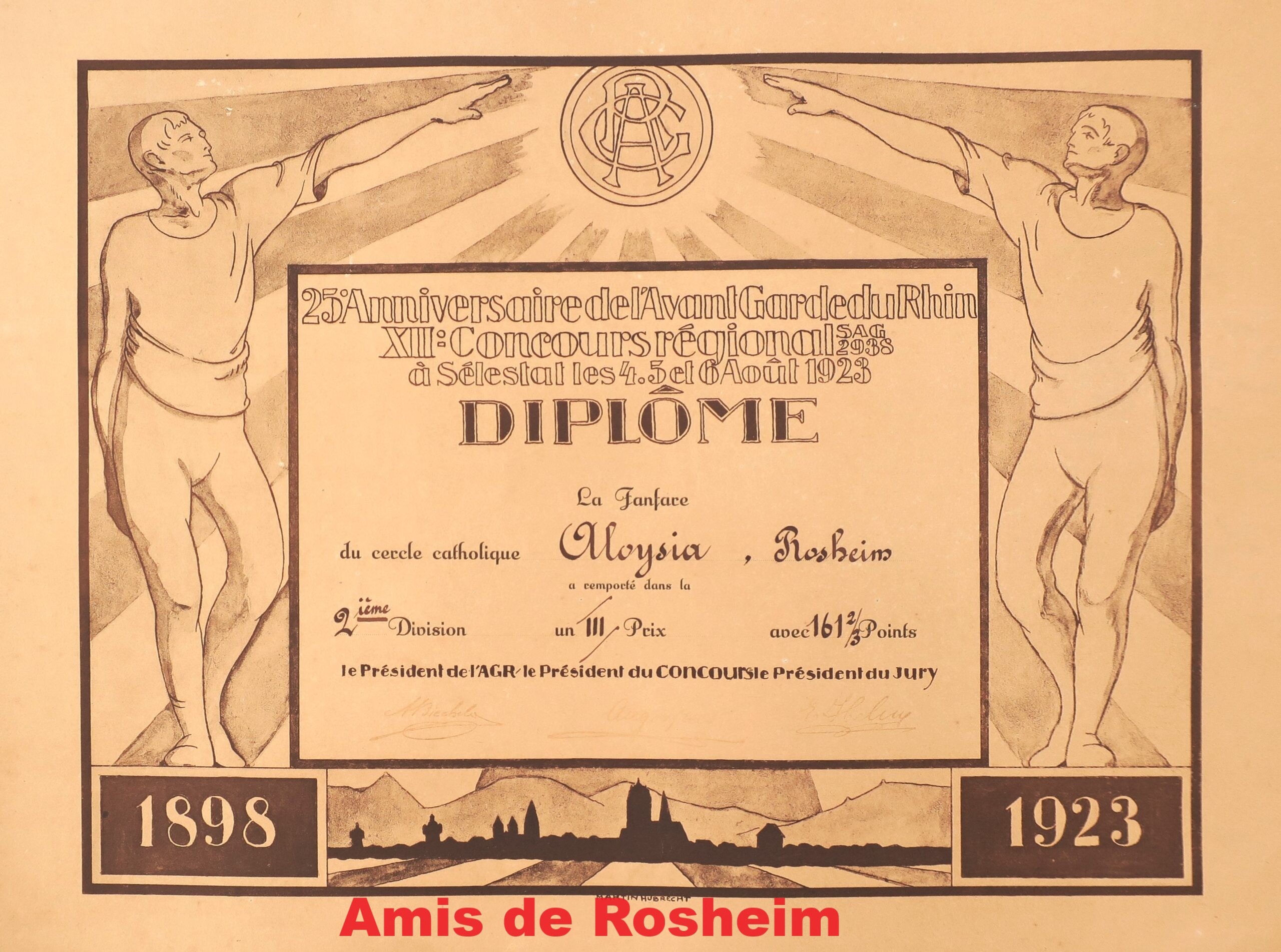 4 – Le concours régional de Sélestat, organisé par l’AGR du 4 au 6 août 1923, pour le 25ème anniversaire, a accueilli 207 sections avec plus de 8000 gymnastes. La fanfare et les gymnastes ont rejoint la manifestation le 5 août par un train spécial au départ de Rosheim à 5h52. La fanfare est revenue avec ce beau diplôme. Son chef, Eugène Siffert, y a obtenu une médaille d’argent.