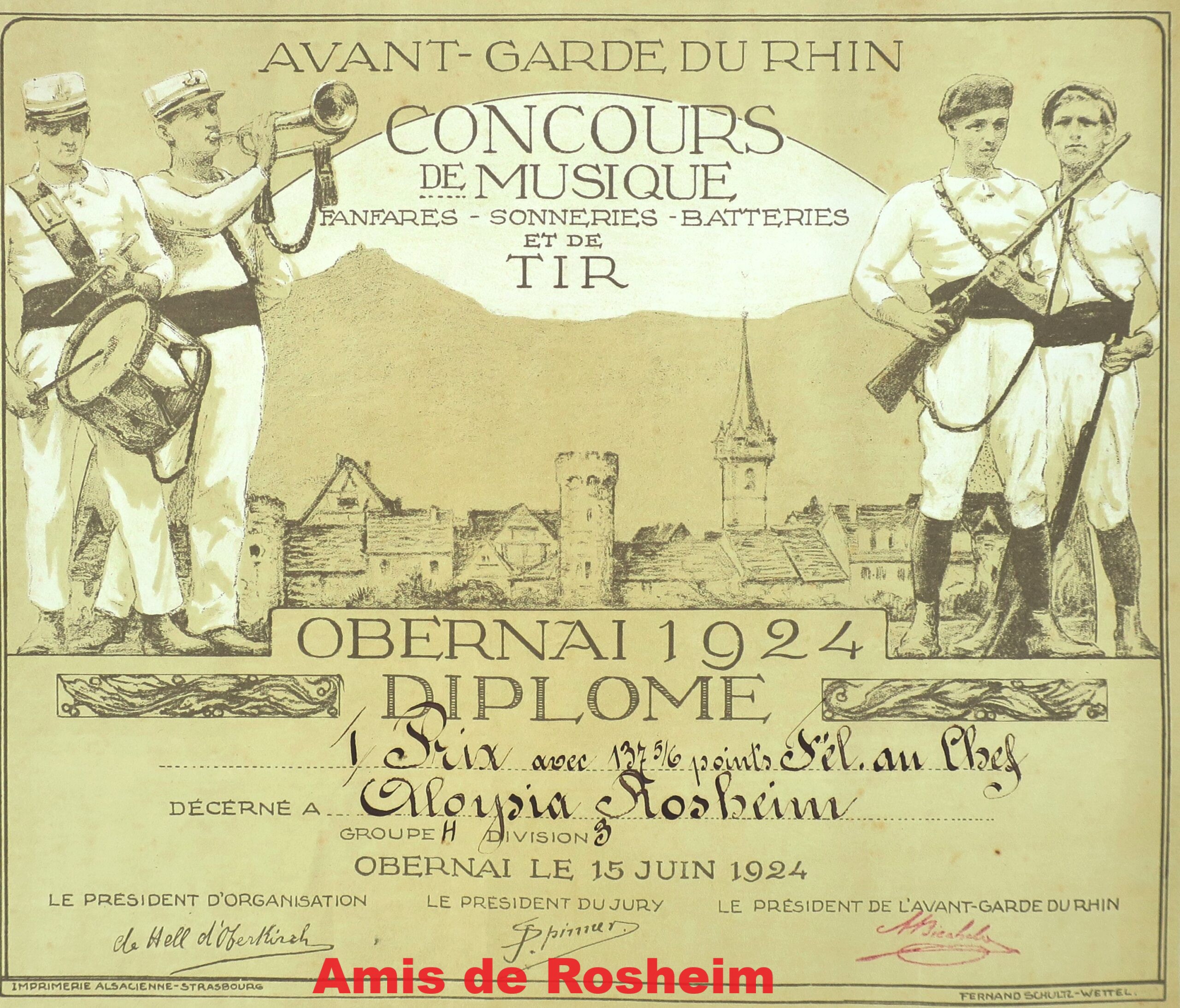5 – La Fanfare du Cercle Aloysia de Rosheim a obtenu un premier prix au Concours de Musique et de Tir de l’AGR organisé le 15 juin 1924 à Obernai. Elle est revenue avec ce beau diplôme illustré par l’artiste-peintre et graveur obernois Fernand Schultz-Wettel (1872-1957).