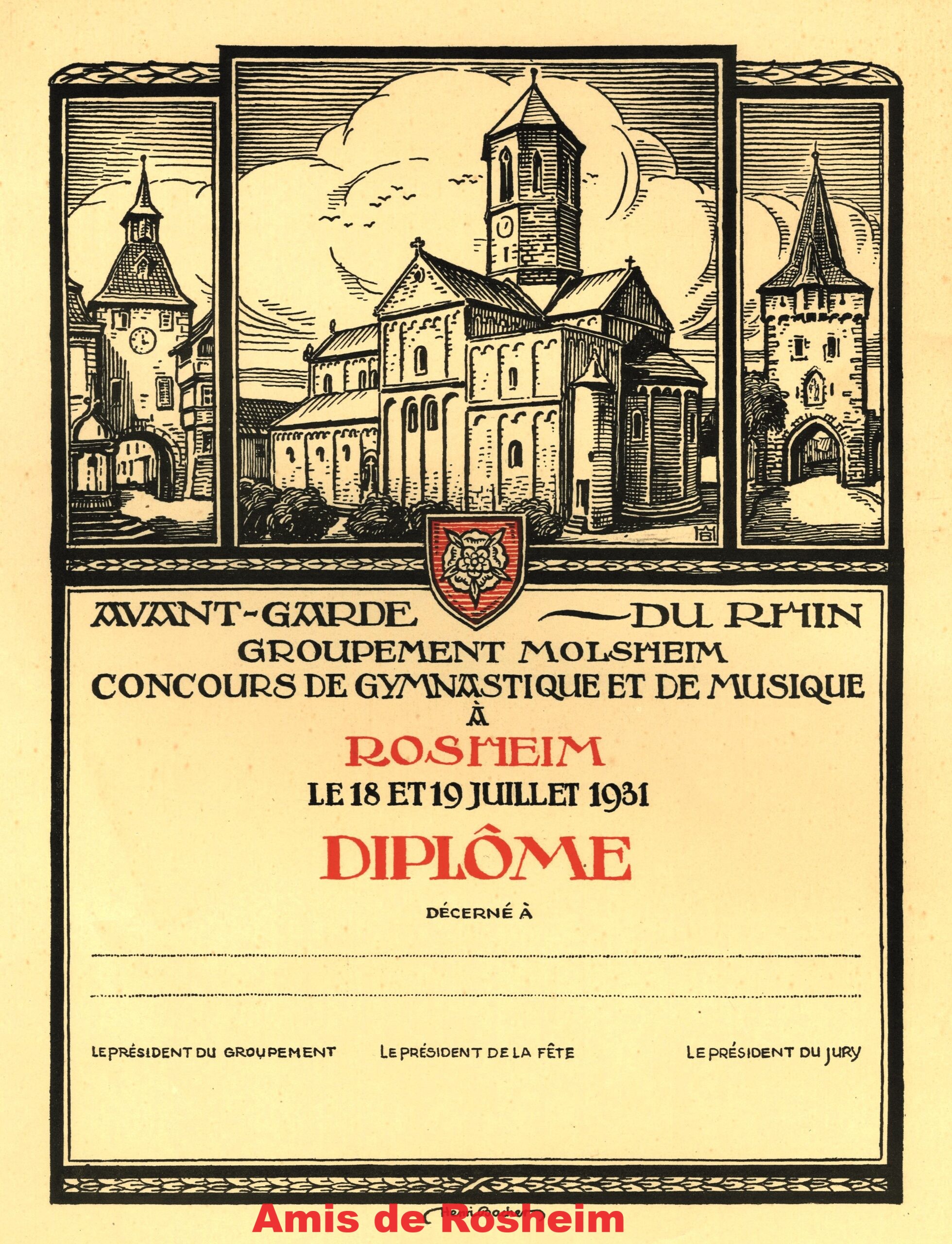 5 – Diplôme réalisé à l’occasion du Concours de gymnastique et de musique du groupement Molsheim de l’Avant Garde du Rhin, organisé à Rosheim en 1931. Son illustration a été confiée au célèbre artiste-peintre, graveur et illustrateur Henri Bacher (1890-1934).