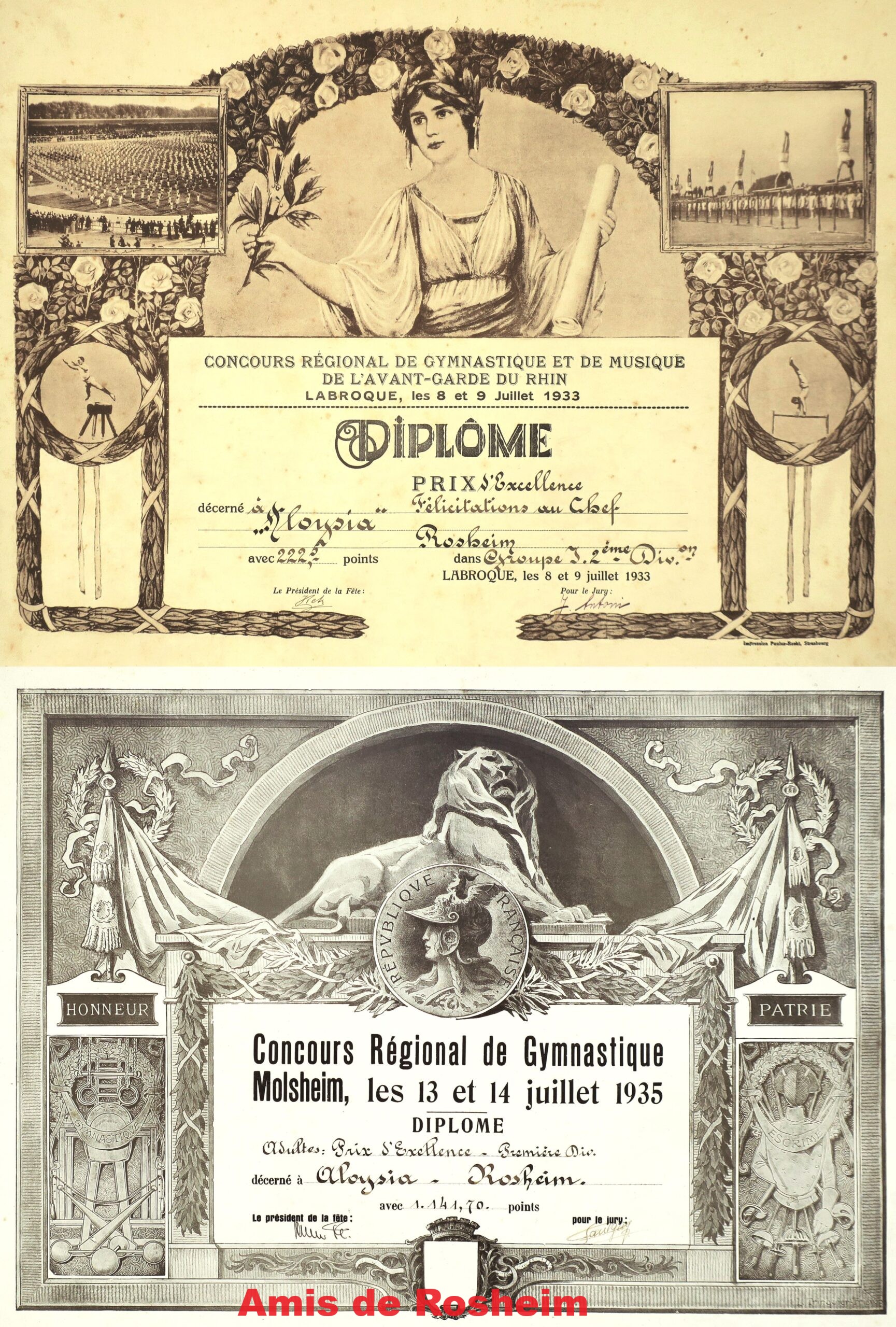8 – Diplômes décernés aux différentes sections du Cercle Aloysia lors des Concours régionaux organisés à La Broque en 1933 et à Molsheim en 1935.