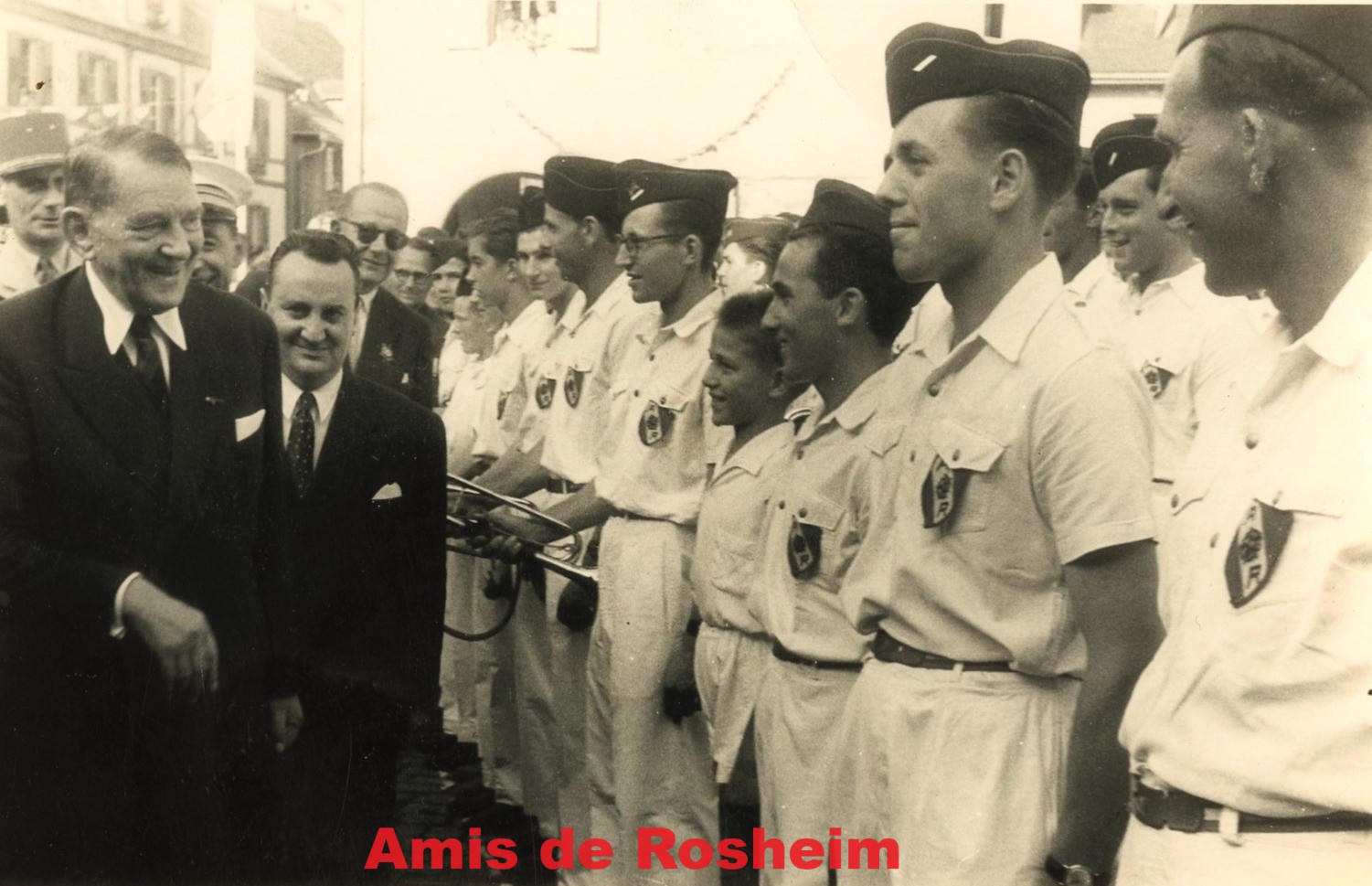 4 – Les membres du Cercle Aloysia sont présentés au président de la République René Coty lors de sa visite officielle à Rosheim le 6 juillet 1957.