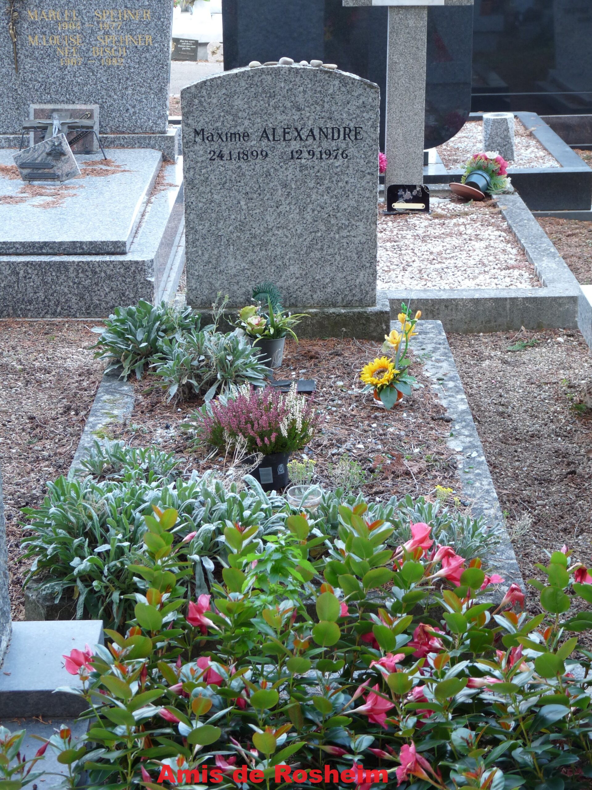 6 – La tombe de Maxime Alexandre (1899 – 1976). poète et auteur dramatique alsacien, témoin du surréalisme des premières années. Sa femme évoque sa mémoire : « Il blaguait en alsacien et adorait Lewis Carrol. Il plaçait la vie et la pêche au-dessus de la poésie. Le brochet, ça s’était important pour lui ».