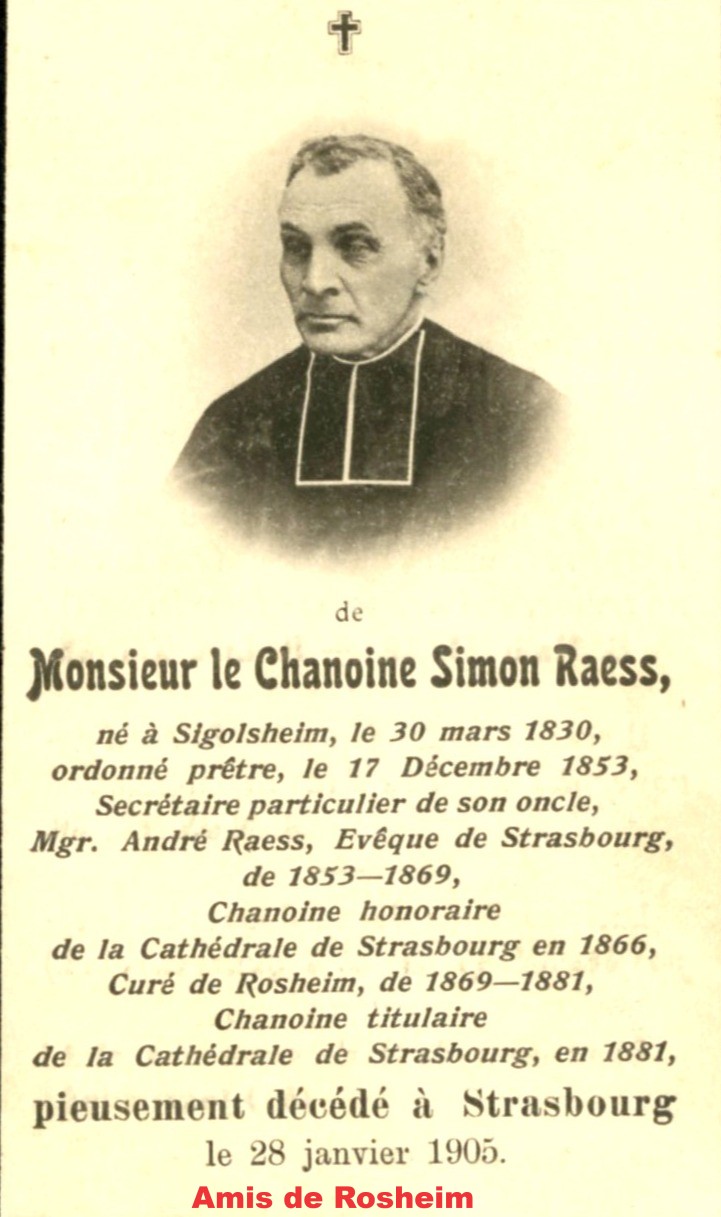 Puis Simon Raess, qui sera en poste à Rosheim de 1869 à 1881. Il sera lui aussi secrétaire particulier de son oncle Mgr André Raess avant d’assurer la charge de la cure de Rosheim dans les temps difficiles de la défaite de 1870 et de l’annexion de l’Alsace Lorraine à l’Empire Allemand. En 1881, il sera promu Chanoine titulaire de la Cathédrale de Strasbourg et quitte la paroisse. Ainsi se termine pour les paroissiens de Rosheim l’épisode Raess qui aura duré soixante ans de 1812 à 1881.