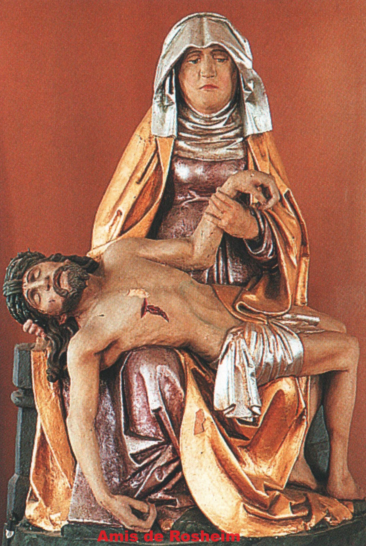 6 – La Vierge de Piété (Pietà) en tilleul datant des années 1500, elle a été retirée comme les statues de Saint Jean et de Sainte Madeleine lors de la restauration. Elles sont conservées au presbytère de Rosheim.