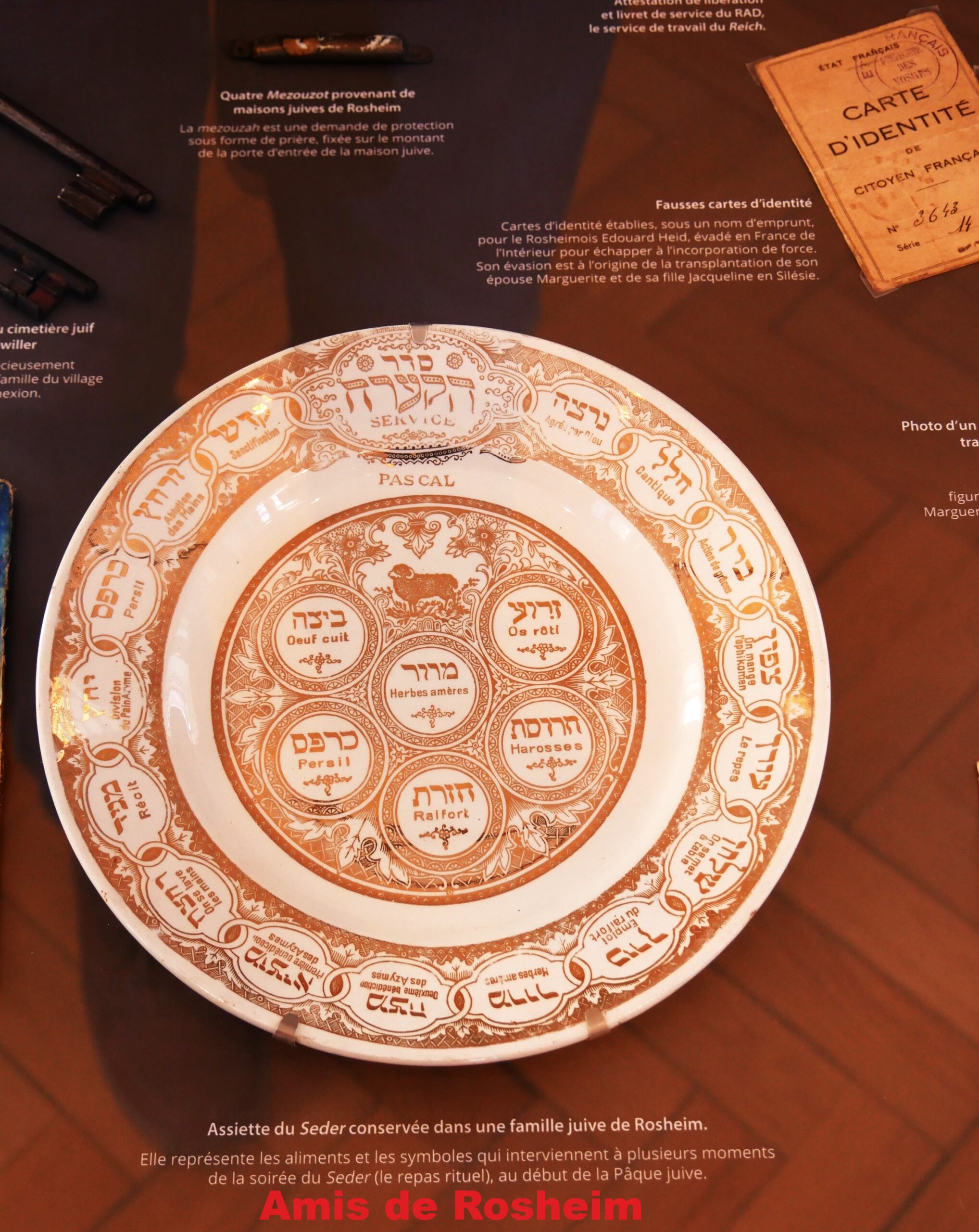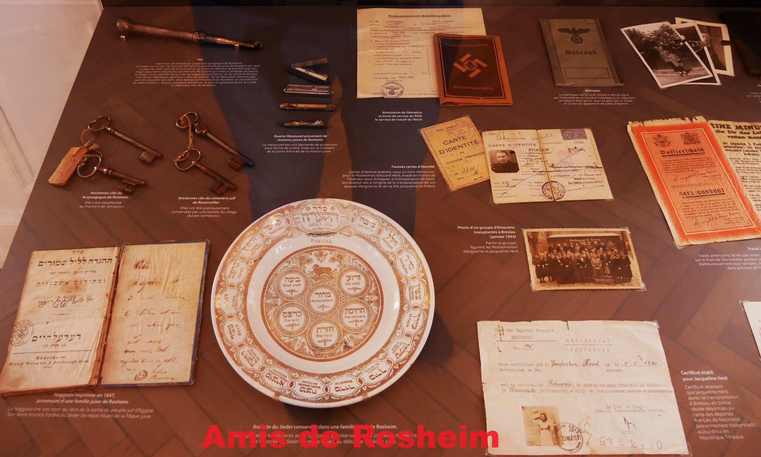 2 – Objets provenant de familles juives de Rosheim (Yad, main de lecture utilisée à la synagogue de Rosheim, les anciennes clés de la synagogue et du cimetière israélite de Rosenwiller, une Haggada, l’assiette du Seder, quatre mezouzot), la fausse carte d’identité d’Edouard Heid (Berten) dont l’évasion est à l’origine de la transplantation de Marguerite Heid et de sa fille …