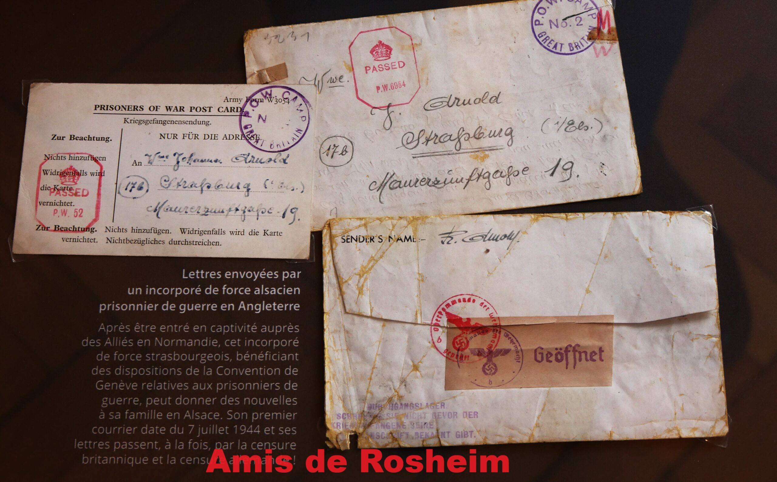 8 – Lettres envoyées par un incorporé de force alsacien prisonnier de guerre en Angleterre. Son courrier du 7 juillet 1944 est passé d’abord par la censure britannique puis par la censure allemande.