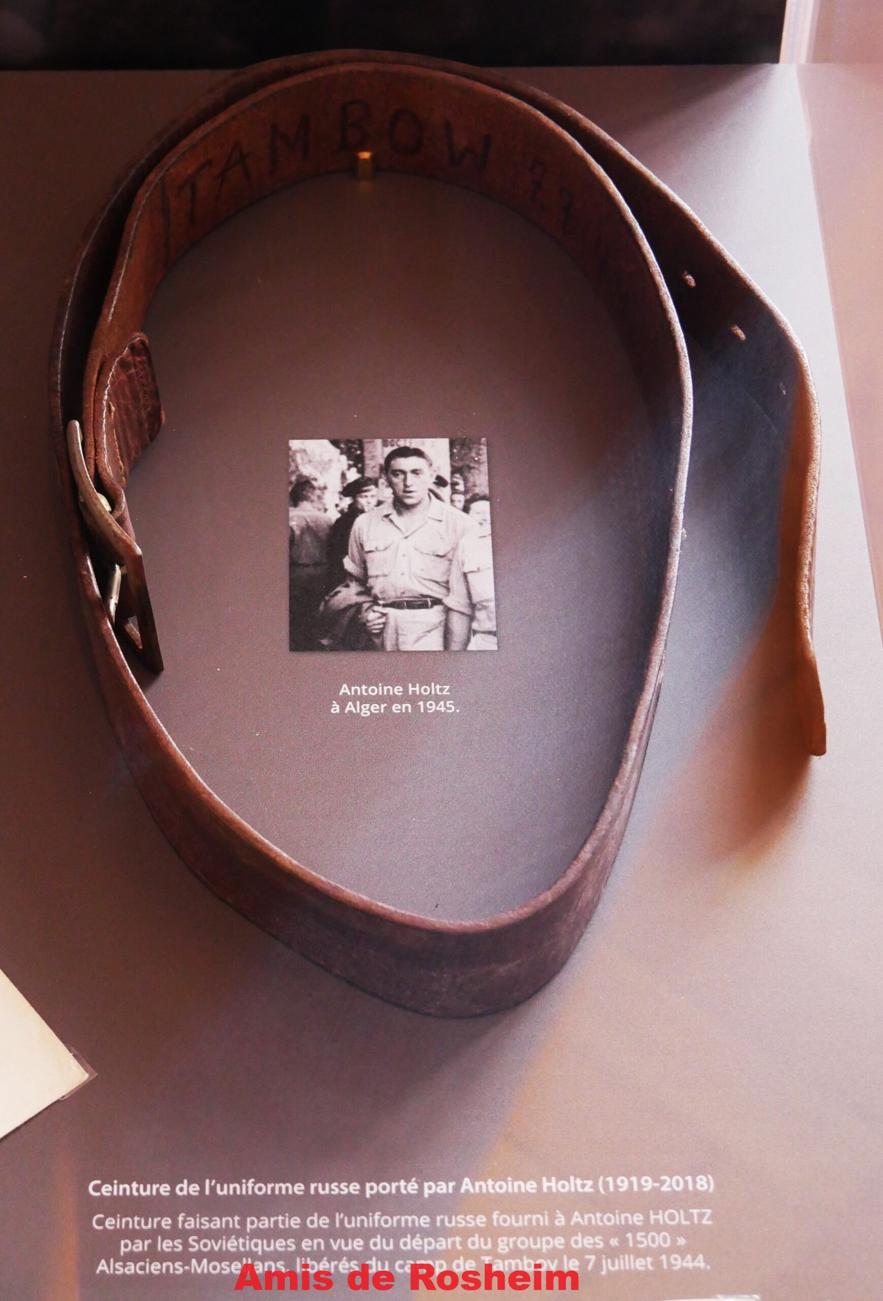 5 – Ceinture russe portée par Antoine HOLTZ (27/11/1919 – 15:03/2018) qui faisait partie du contingent des 1500 prisonniers russes ayant pu quitter le camp de regroupement de Tambov le 7 juillet 1944. Dès le printemps 1943, les Alliés constatent la présence d’Alsaciens-Mosellans parmi les prisonniers de guerre allemands dans les camps soviétiques. L’idée de créer une brigade Alsace-Lorraine qui combattrait aux côtés des Forces Françaises Libres émerge rapidement. Ce n’est qu’un an plus tard que le gouvernement soviétique accepte l’idée de libérer un contingent (qui sera le seul avant la fin de la guerre) de 1500 prisonniers alsaciens et mosellans, regroupés au camp de Tambov. Sont exclus les prisonniers trop faibles ou malades, ainsi que ceux jugés peu fiables idéologiquement.