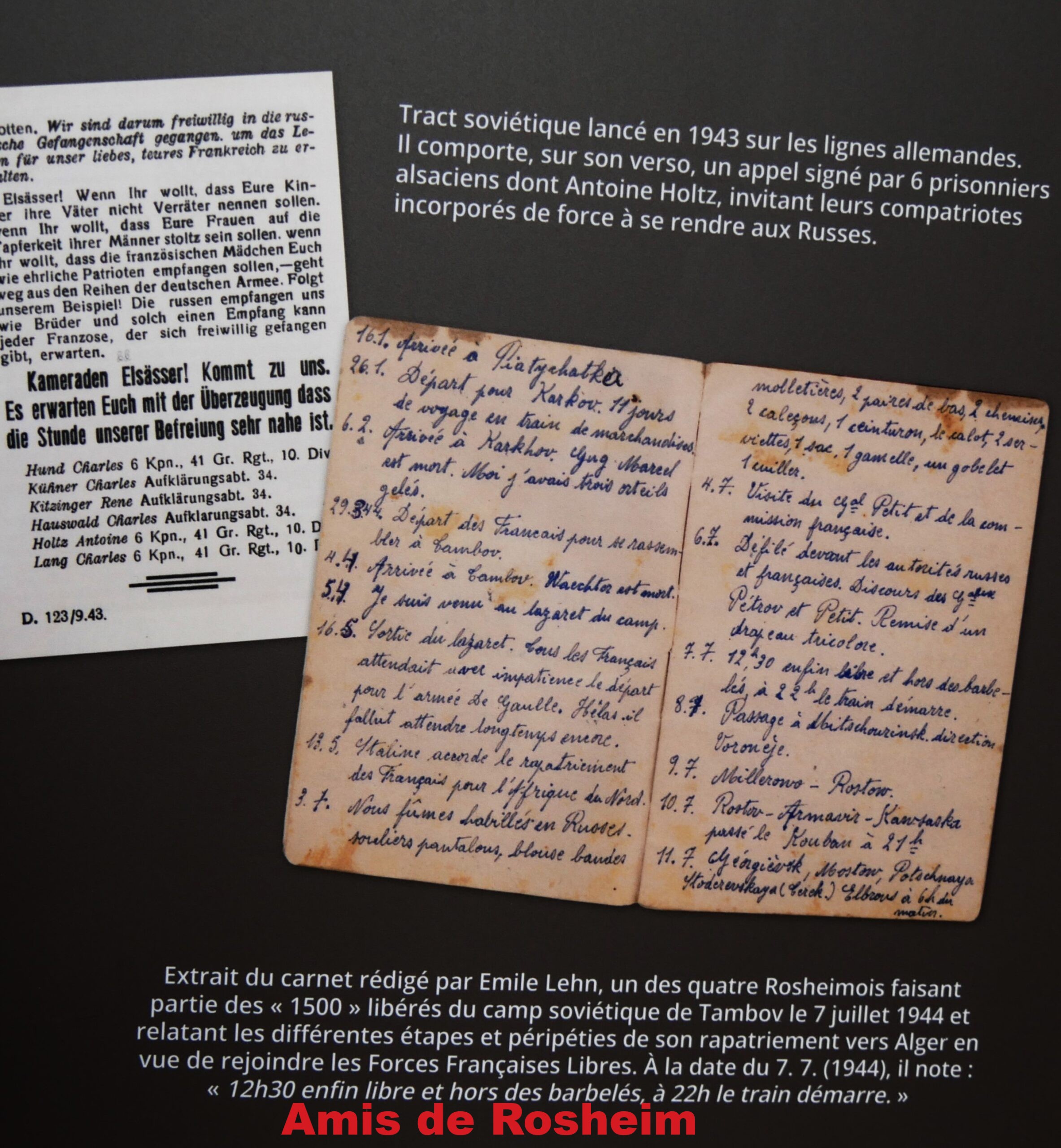 7 – Extrait du carnet rédigé par Emile Lehn, un des quatre Rosheimois ( avec Antoine Holtz, Victor Muller, Lucien Scherrer ) faisant partie des « 1500 » libérés du camp soviétique de Tambov le 7 juillet 1944 et relatant les différentes étapes et péripéties de son rapatriement vers Alger en vue de rejoindre les Forces Françaises Libres. À la date du 7/7/1944, il note : « 12h30 enfin libre et hors des barbelés, à 22h le train démarre. »