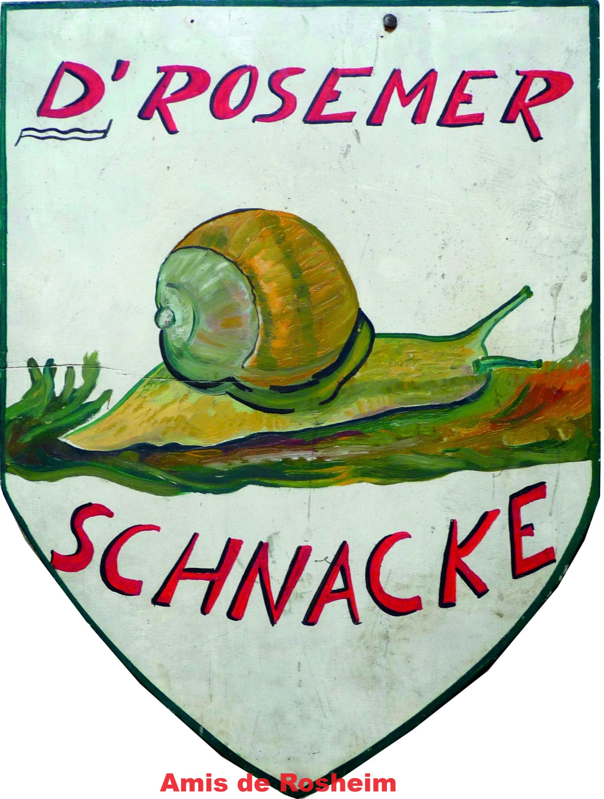 3 – Emblème des « Rosemer Schnacke », l’ensemble folklorique créé en 1972. Le panneau qui leur servait de bannière avait été réalisé par l’artiste peintre Louis Wagner.
