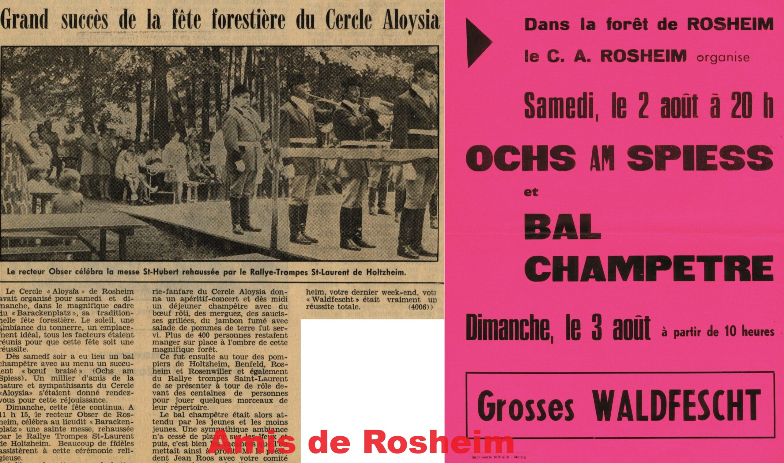La fête forestière (« Waldfescht ») a connu 4 éditions successives de 1972 à 1975. Organisée au coeur de la forêt de Rosheim, dans la clairière du « Barackenplatz » sur la route de l’Ochsenleger, rassemblait jusqu’à 4000 personnes. Au programme : bal champêtre, boeuf à la broche, Messe de St Hubert, concerts et représentations des différentes Sections du Cercle.