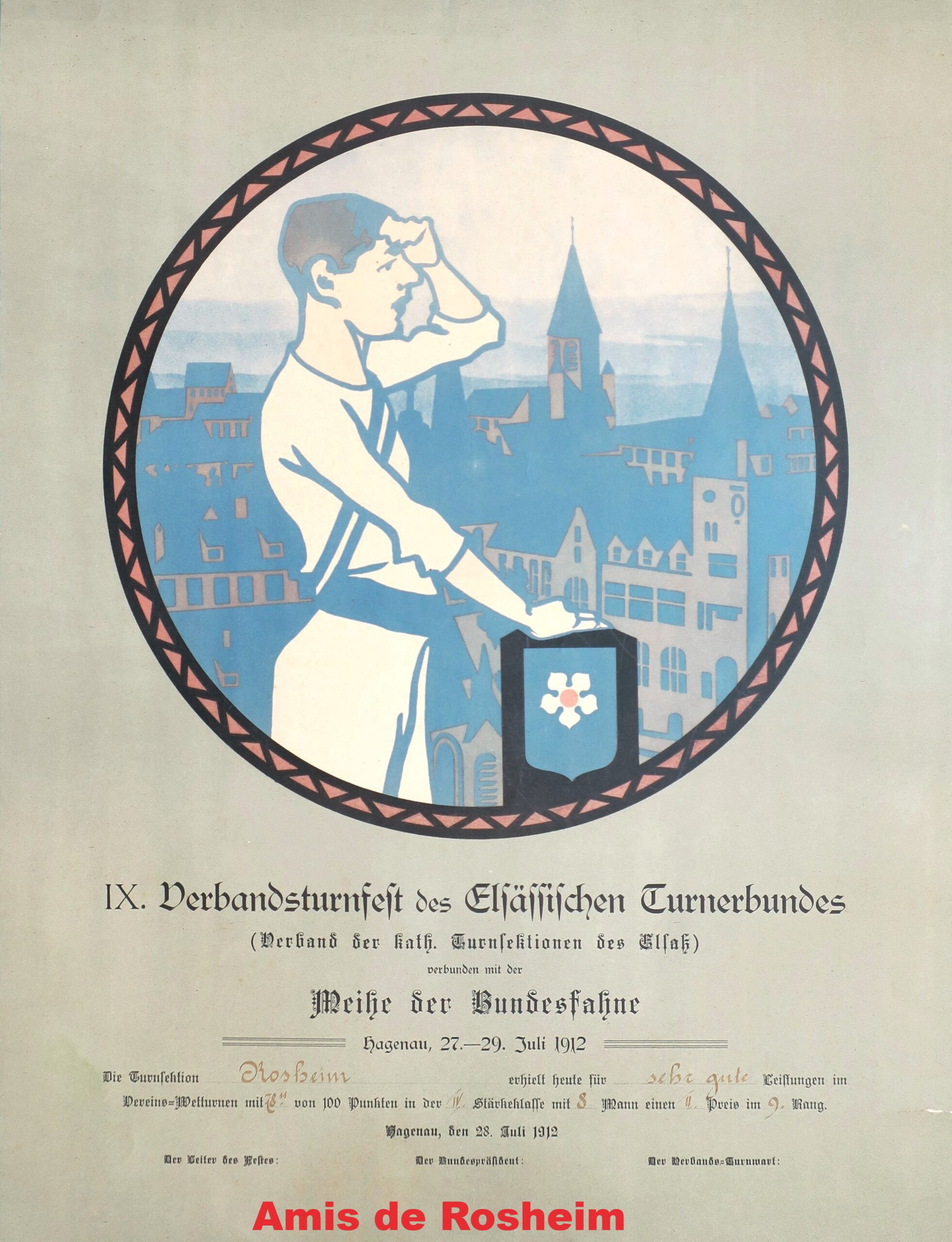 2 – En 1898 est créé l »Elsässer Turnerbund » (ligue alsacienne de gymnastique) qui est l’ancêtre de l’Avant Garde du Rhin (AGR). Son drapeau a été béni en 1912 à Haguenau et la section de gymnastique de Rosheim a obtenu ce beau diplôme.