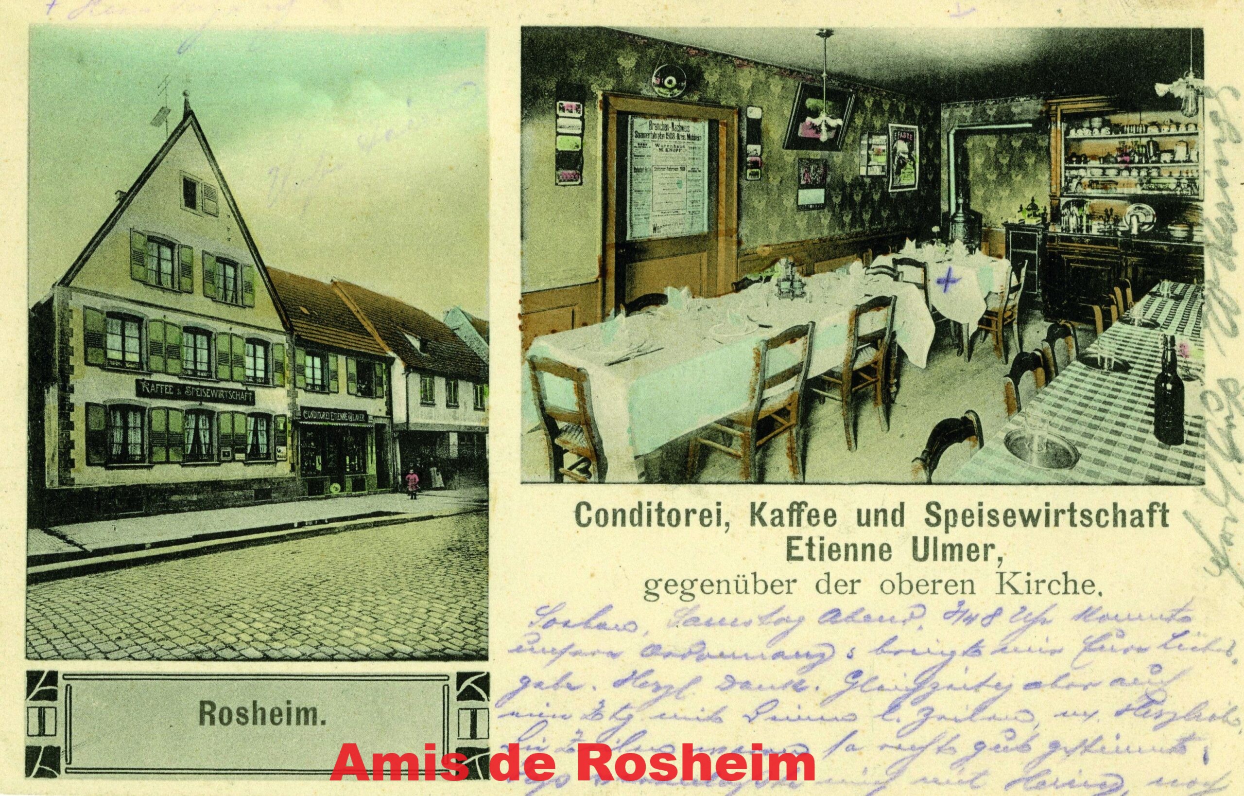 4. Situé en face de l’église Saint-Etienne, la maison tenue par Etienne Ulmer (appelé le pâtissier) était à la fois une pâtisserie, un café et un restaurant. La qualité de ses mets et l’excellente tenue de l’établissement étaient très appréciées par la clientèle. Cet établissement portera plus tard l’enseigne « A la ville de Paris » et connaîtra plusieurs gérants avant de devenir une banque.