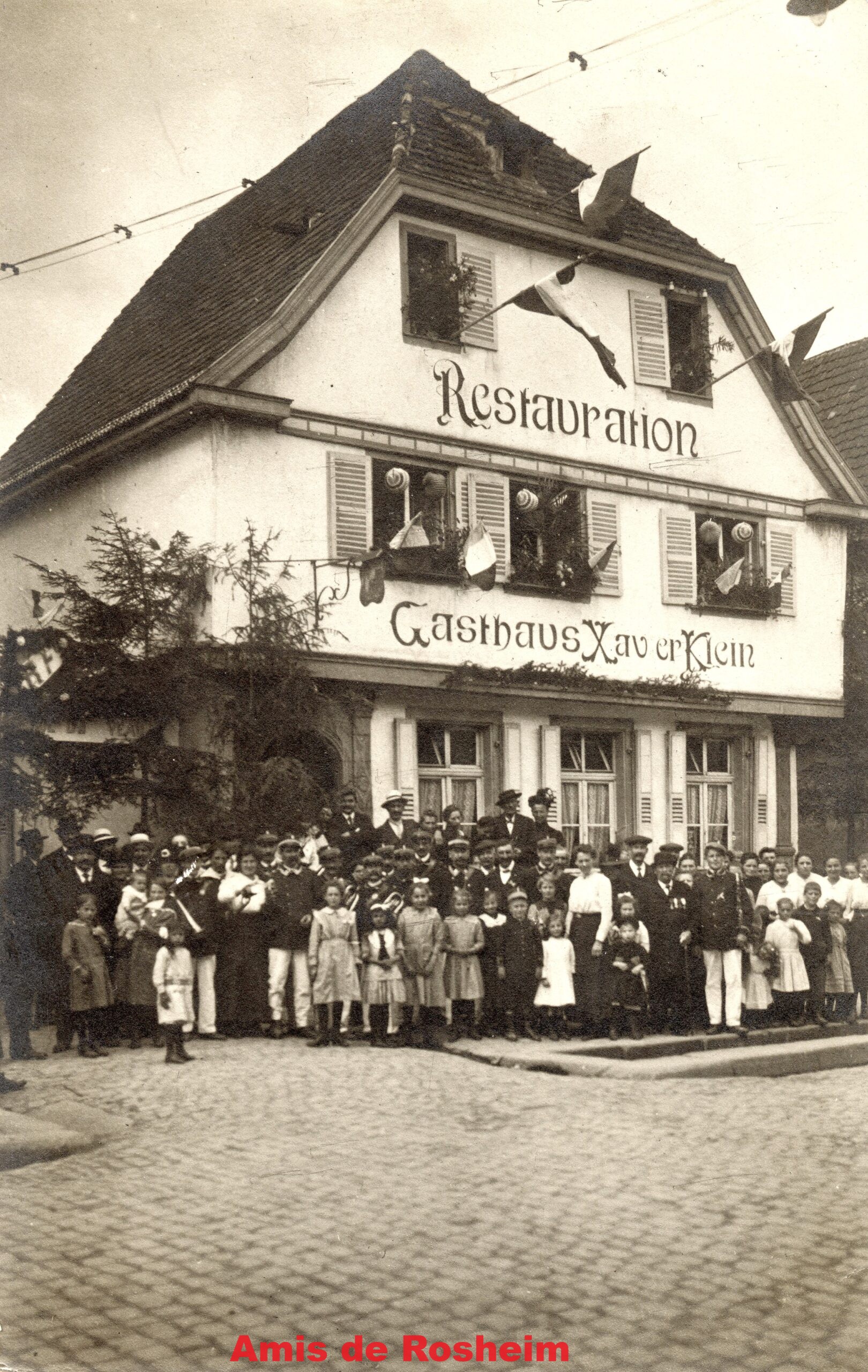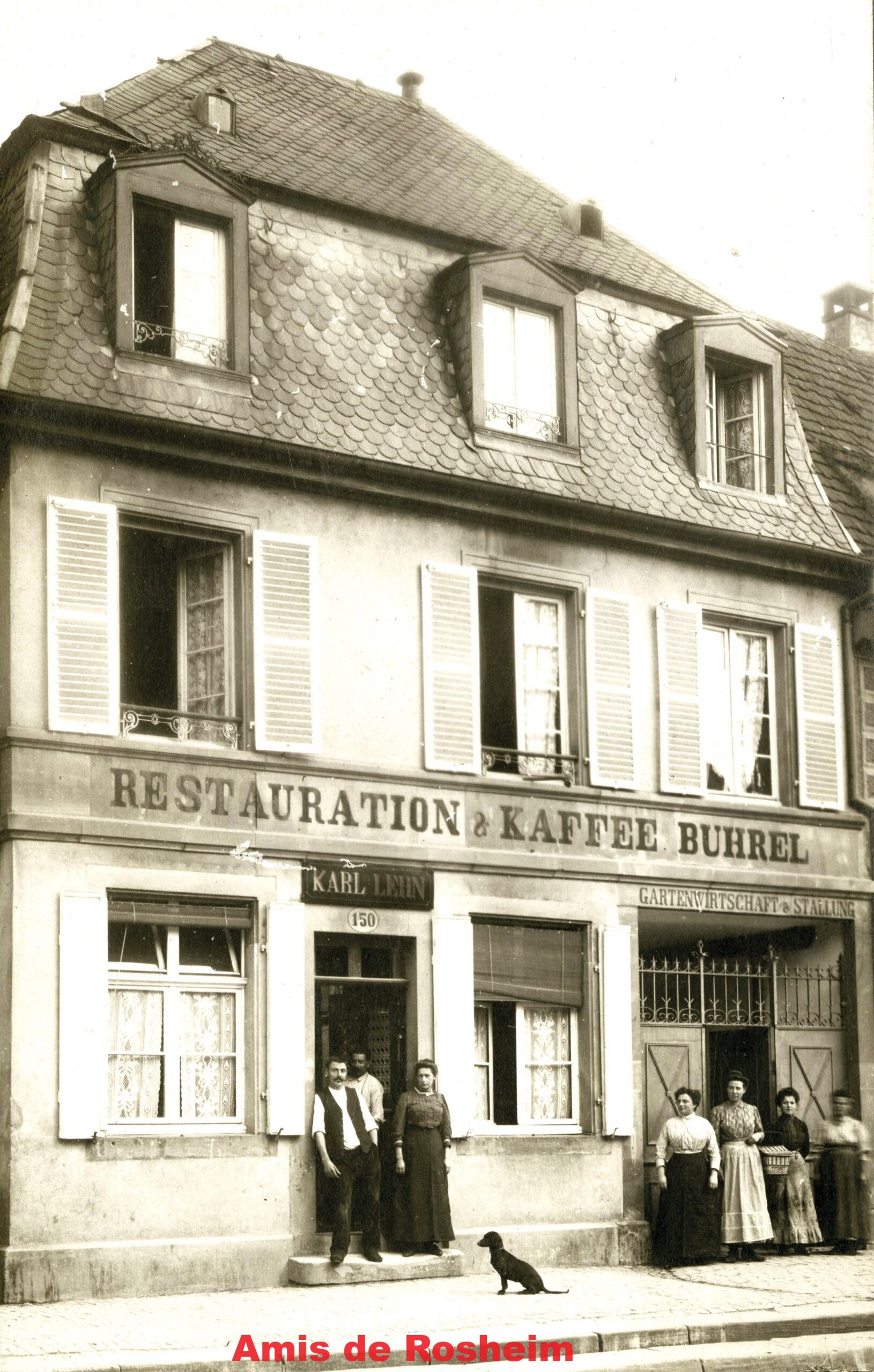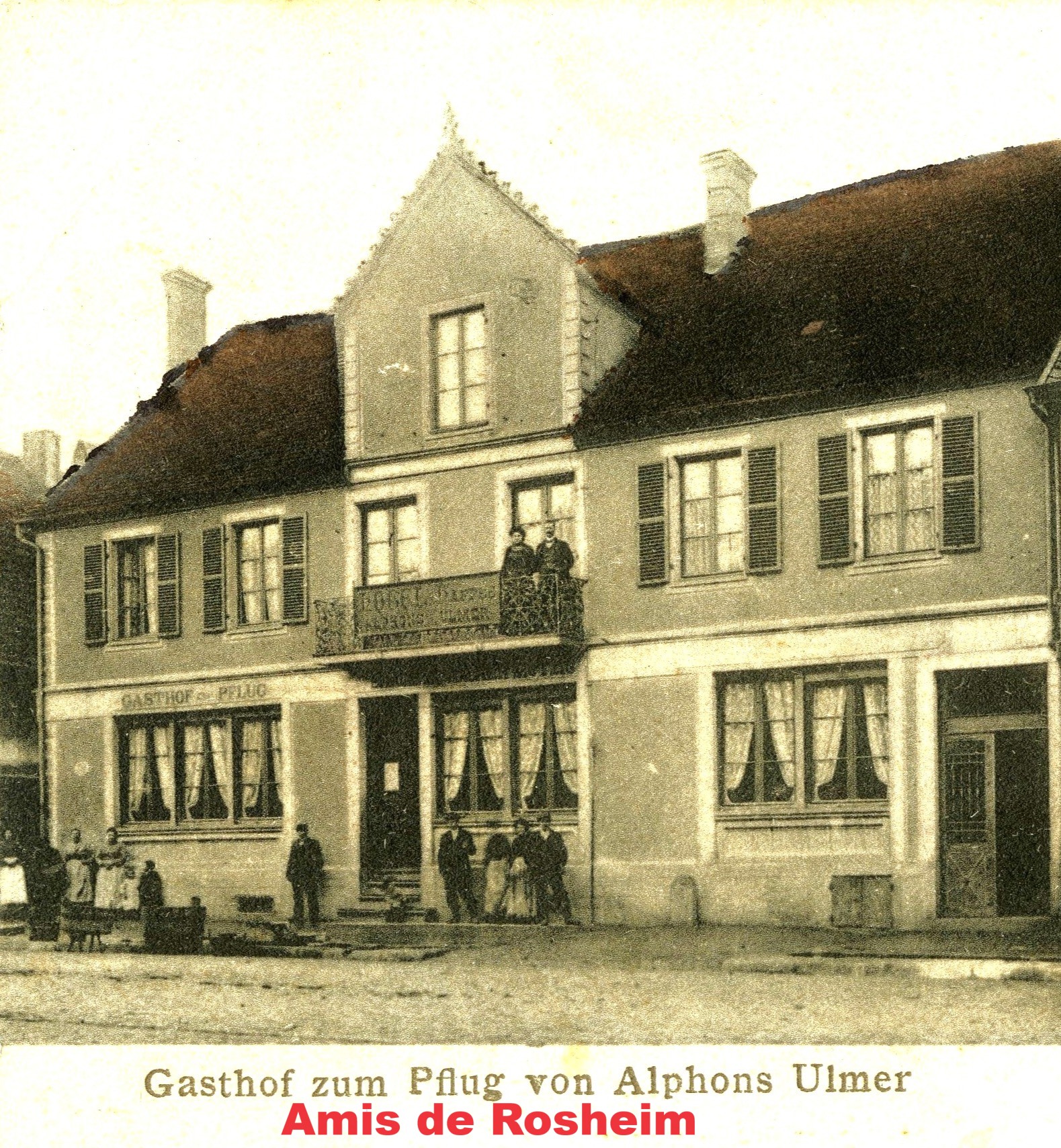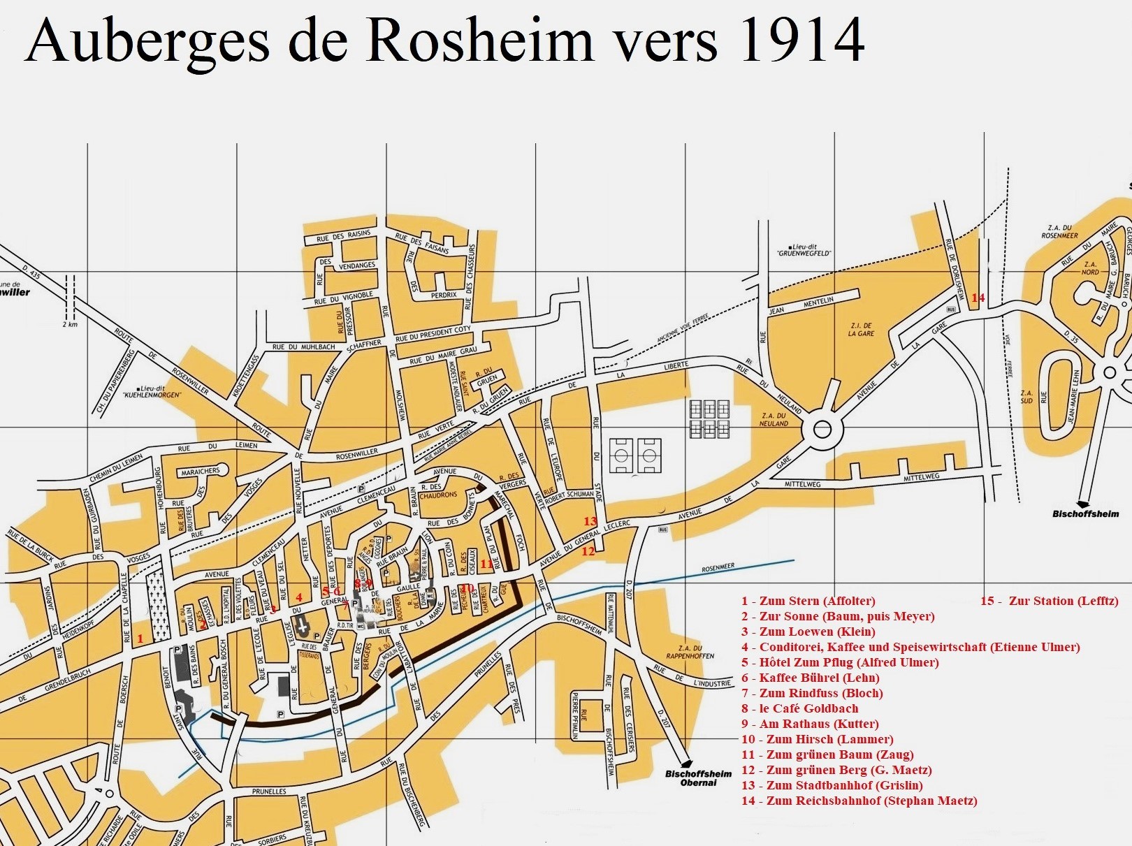 1-Zum Stern (Affolter)  2-Zur Sonne (Baum, puis Meyer) 3-Zum Loewen (Klein) 4-Conditorei, Kaffee und Speisewirtschaft (Etienne Ulmer) 5-Hôtel Zum Pflug (Alfred Ulmer) 6-Kaffee Bührel (Lehn) 7-Zum Rindfuss (Bloch) 8-le Café Goldbach 9-Am Rathaus (Kutter) 10-Zum Hirsch (Lammer) 11-Zum grünen Baum (Zaug)   12-Zum grünen Berg (G. Maetz) 13-Zur Station (Lefftz) 14-Zum Reichsbahnhof (Stephan Maetz) 15- Zum Stadtbanhof (Grislin).