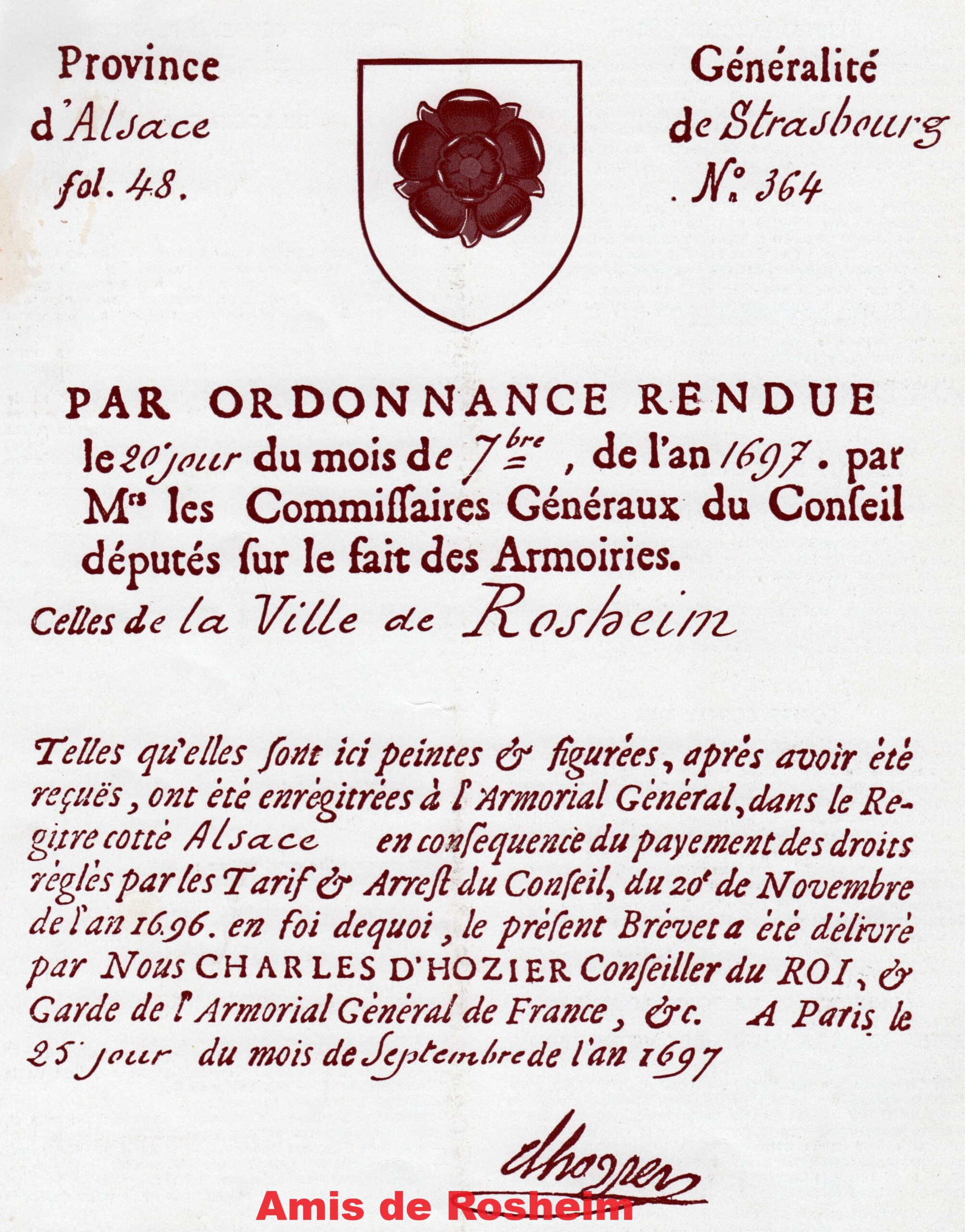 En 1333, le sceau de Rosheim porte un écu au quintefeuille (die Hundsrose). Ces armoiries se retrouveront avec de légères retouches au fil des siècles.