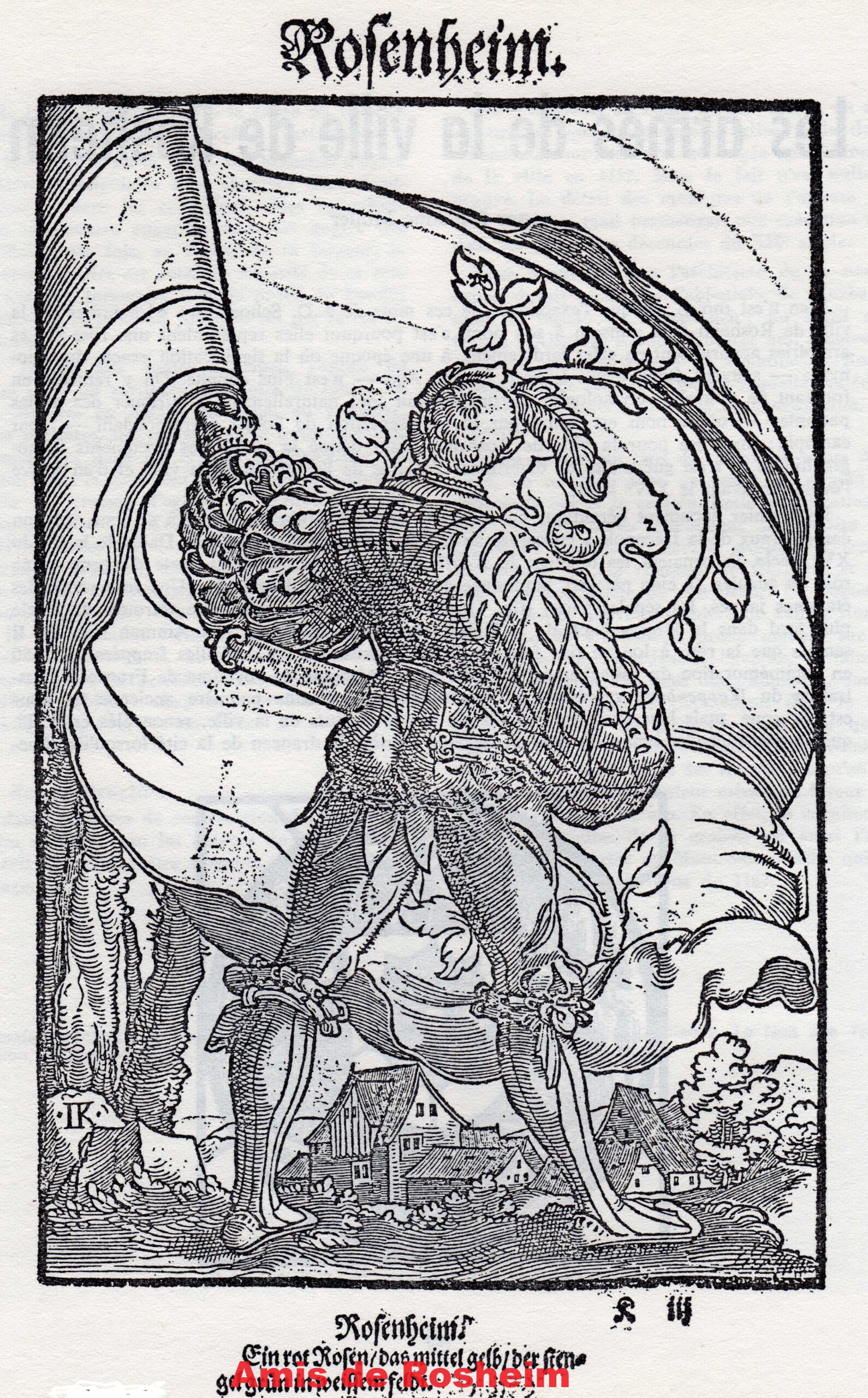 La Gravure du Wappenbuch : porte-étendard (1579) : On retrouve cette rose, à longue tige, sur cette gravure de J. Köbel, réédité en 1579 par Jost Amman : on y voit un personnage portant une bannière ornée d’armoiries, afin que les habitants de la ville puissent la reconnaître de loin et se regrouper autour d’elle lorsqu’ils effectuent des opérations militaires.