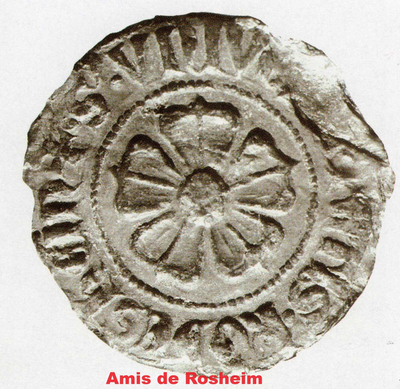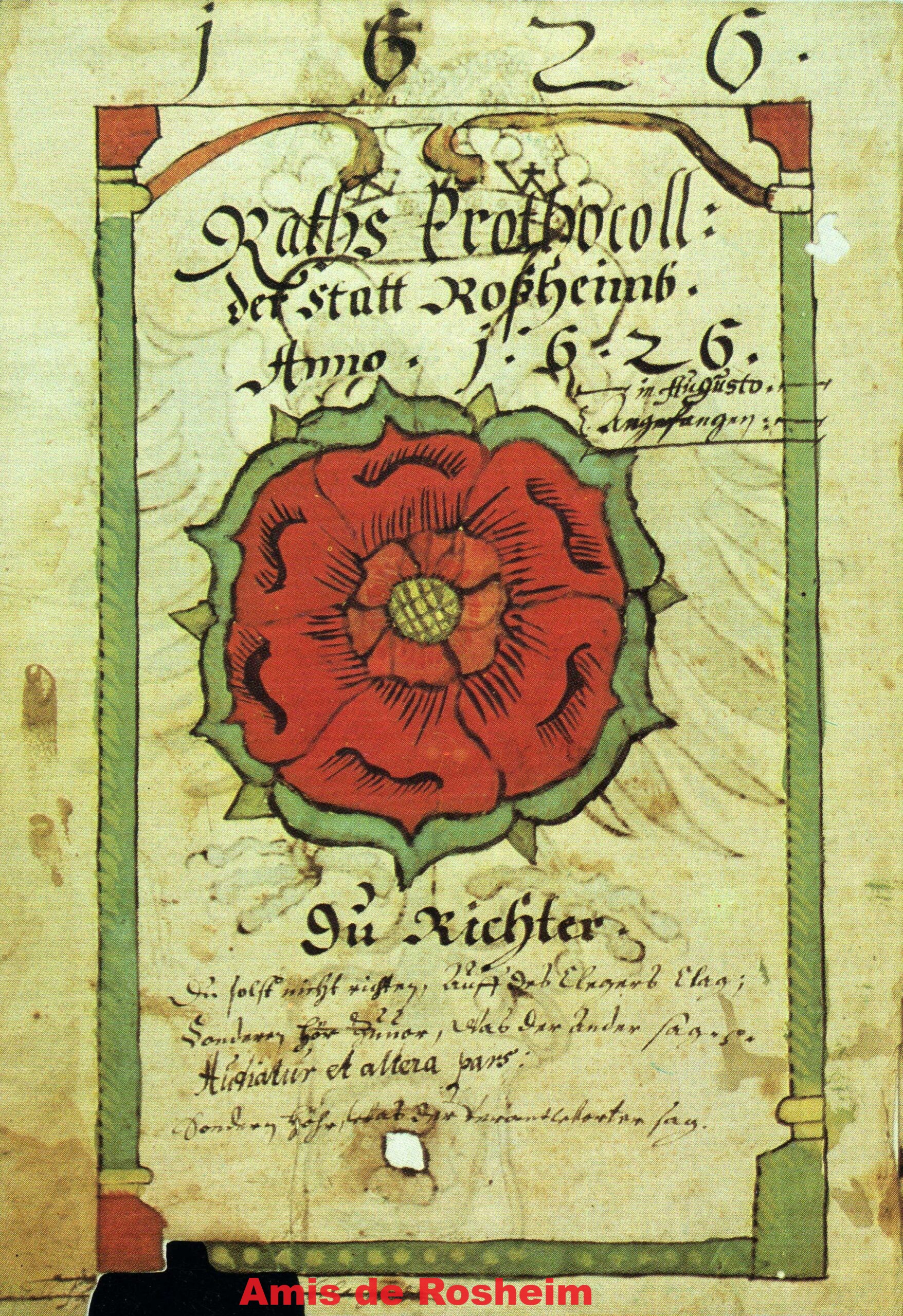 Le Vitrail de la Décapole vers 1480 : Le premier document héraldique en couleurs concernant Rosheim, connu à ce jour, est un des « vitraux de la Décapole » conservés au Musée d’Unterlinden à Colmar. En termes d’héraldique : « Ein rot Rosen, das mittel gelb, die strengel grün in weissen feldt (Rosheim porte d’argent à une rose de gueules, boutonnée d’or, aux pointes de sinople) ». Ces vitraux, datés de la fin du XVe siècle, ornaient les fenêtres de la grande salle du Kaufhaus (Koifhüss, ancienne douane de Colmar) où se réunissaient les délégués des villes.