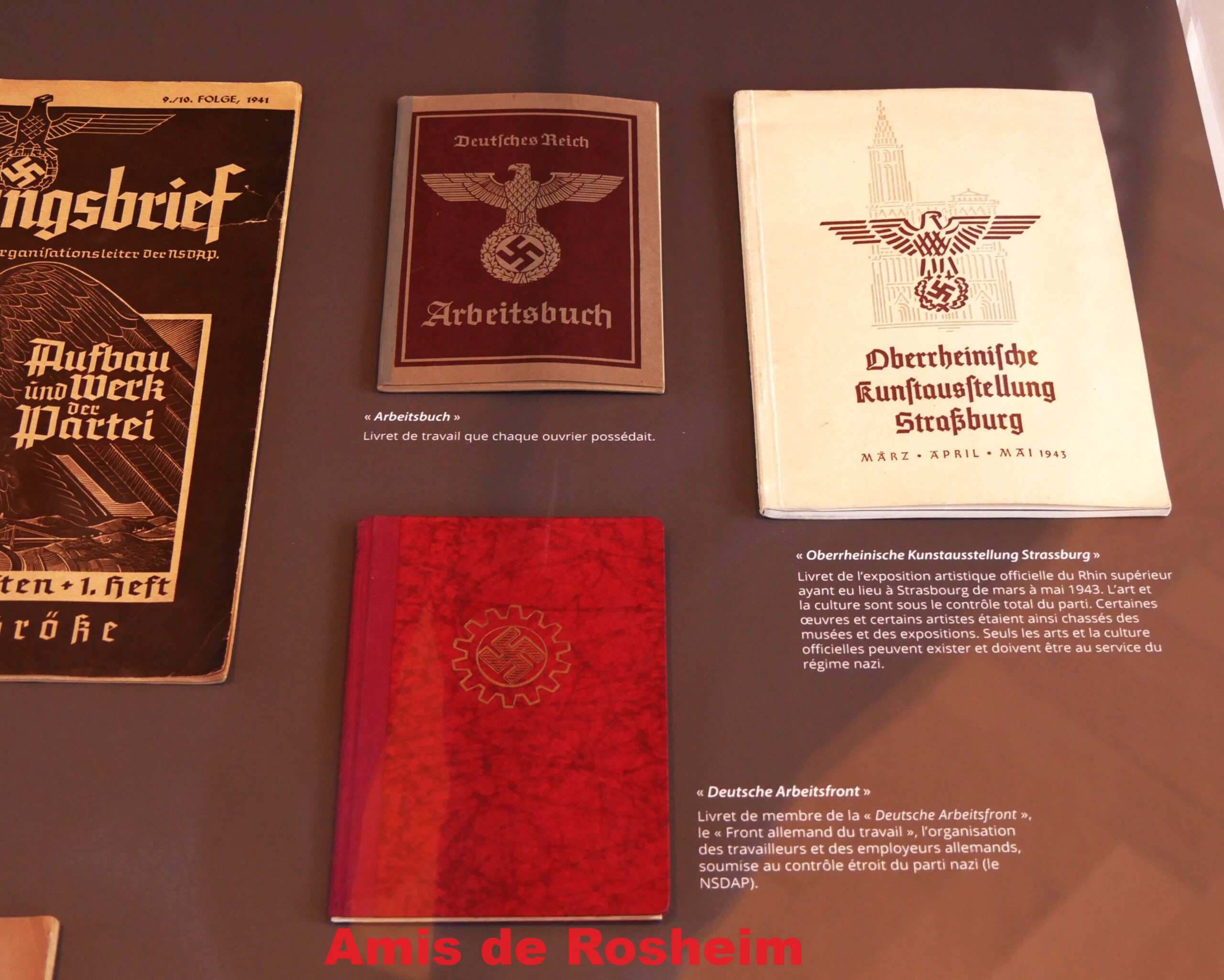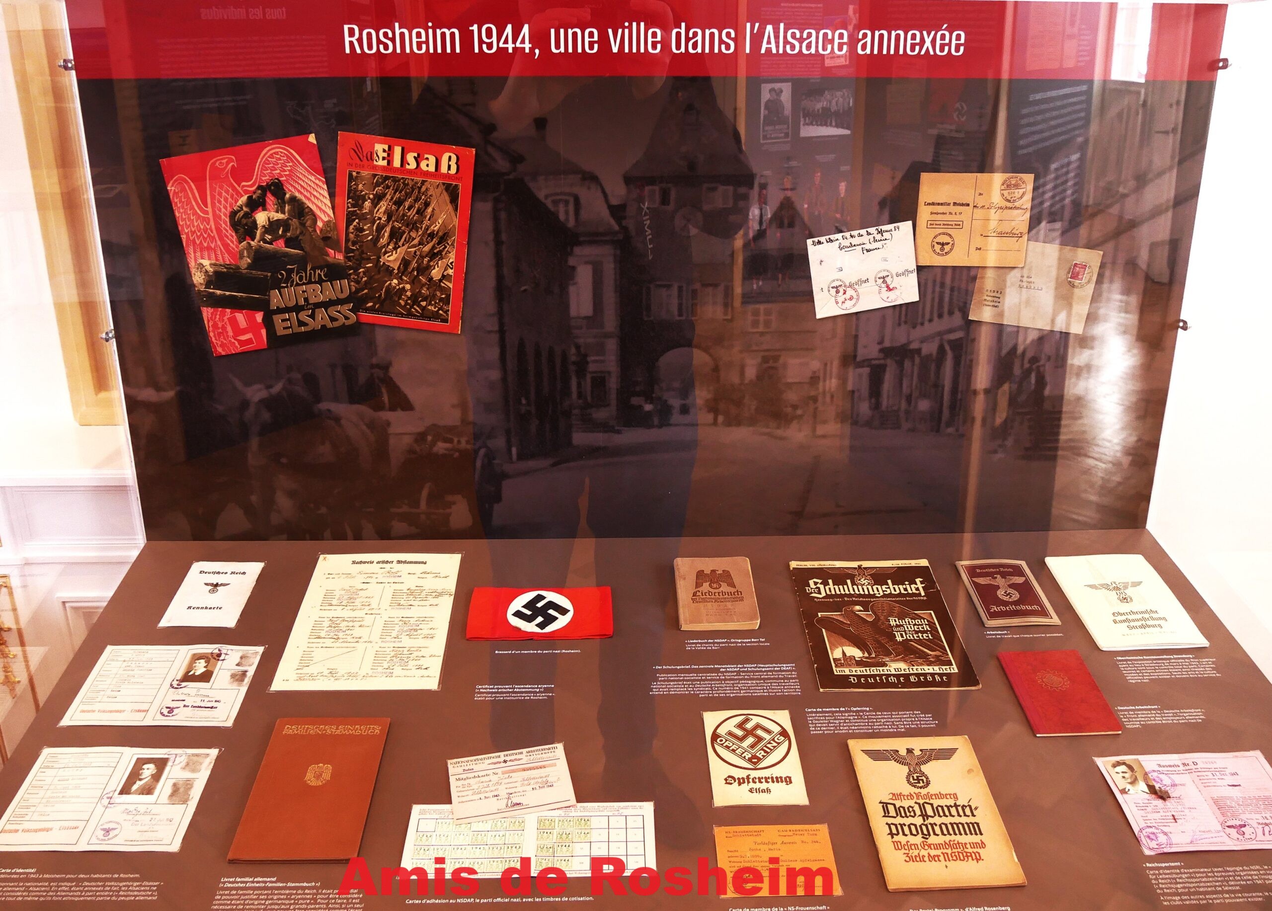 4 – La vitrine « Une ville dans l’Alsace annexée » avec des témoins de cette assimilation : nouvelles cartes d’identité, parti politique unique, adhésions obligatoires aux différentes organisations nazies,