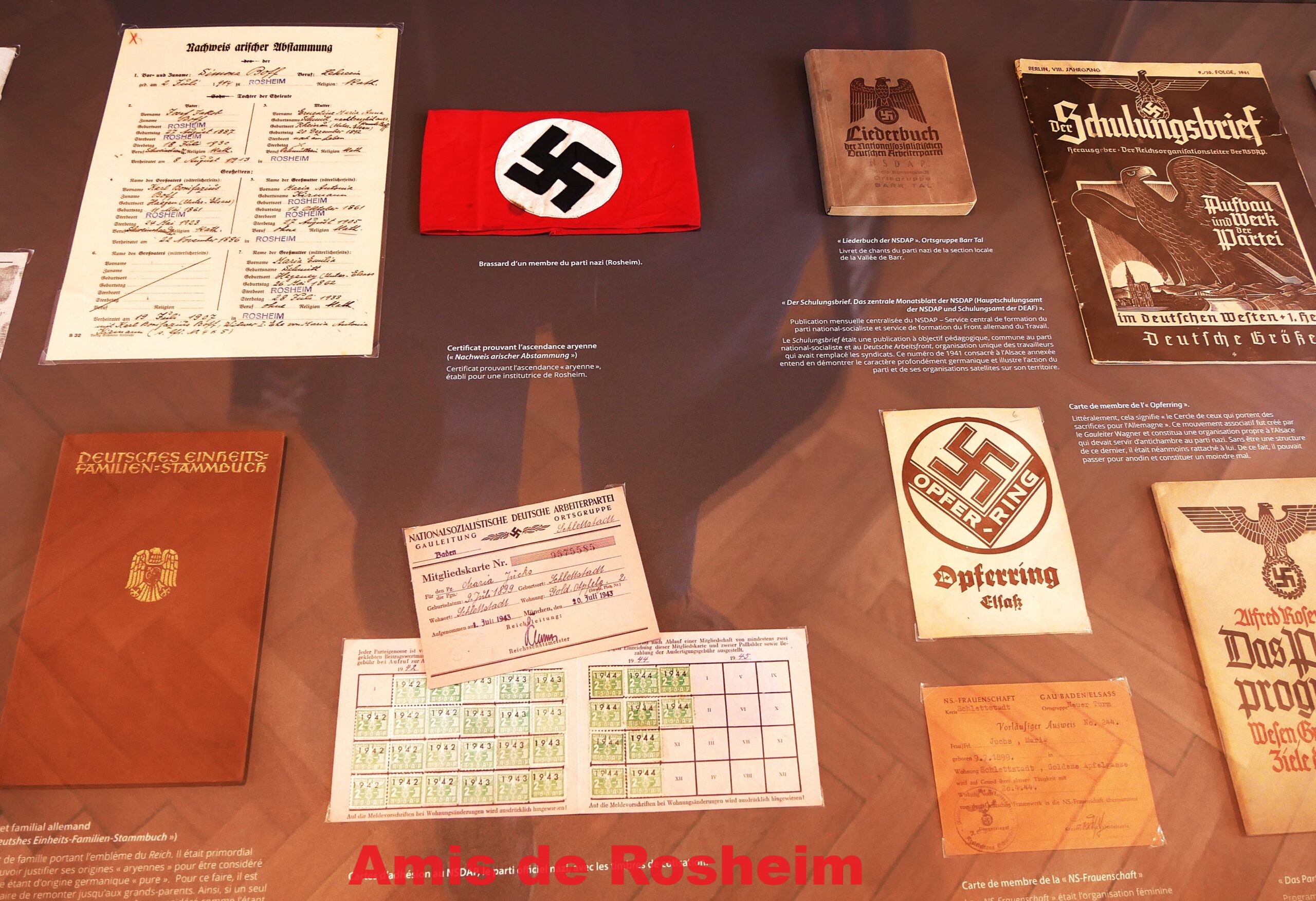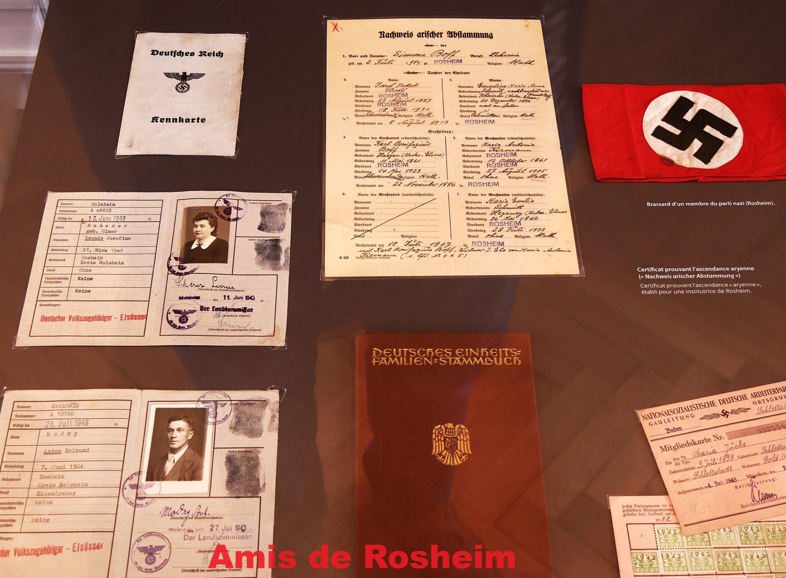 6 – Certificat prouvant l’origine « aryenne » (Nachweis arischer Abstammung) établi pour une institutrice de Rosheim, brassard d’un membre du parti nazi, livret familial à l’emblème du Reich (Deutsches Einheits Familien Stammbuch) permettant de justifier de ses origines « aryennes », carte d’adhésion au parti nazi (NSDAP) avec les timbres de cotisation.