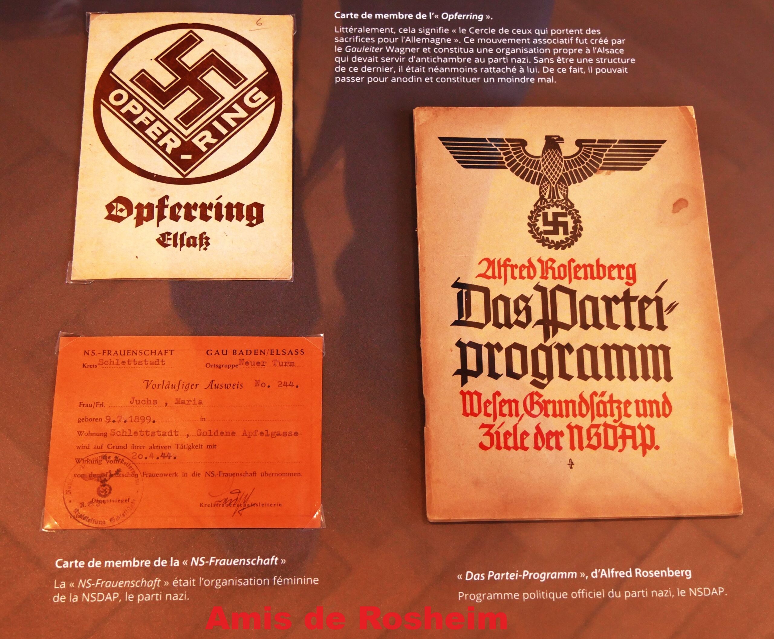 8 – La carte de membre de l’Opferring (cercle de ceux qui portent des sacrifices pour l’Allemagne) créé par le Gauleiter Wagner, une antichambre du parti nazi et une carte de membre de la NS-Frauenschaft , l’organisation féminine du parti nazi (NSDAP).