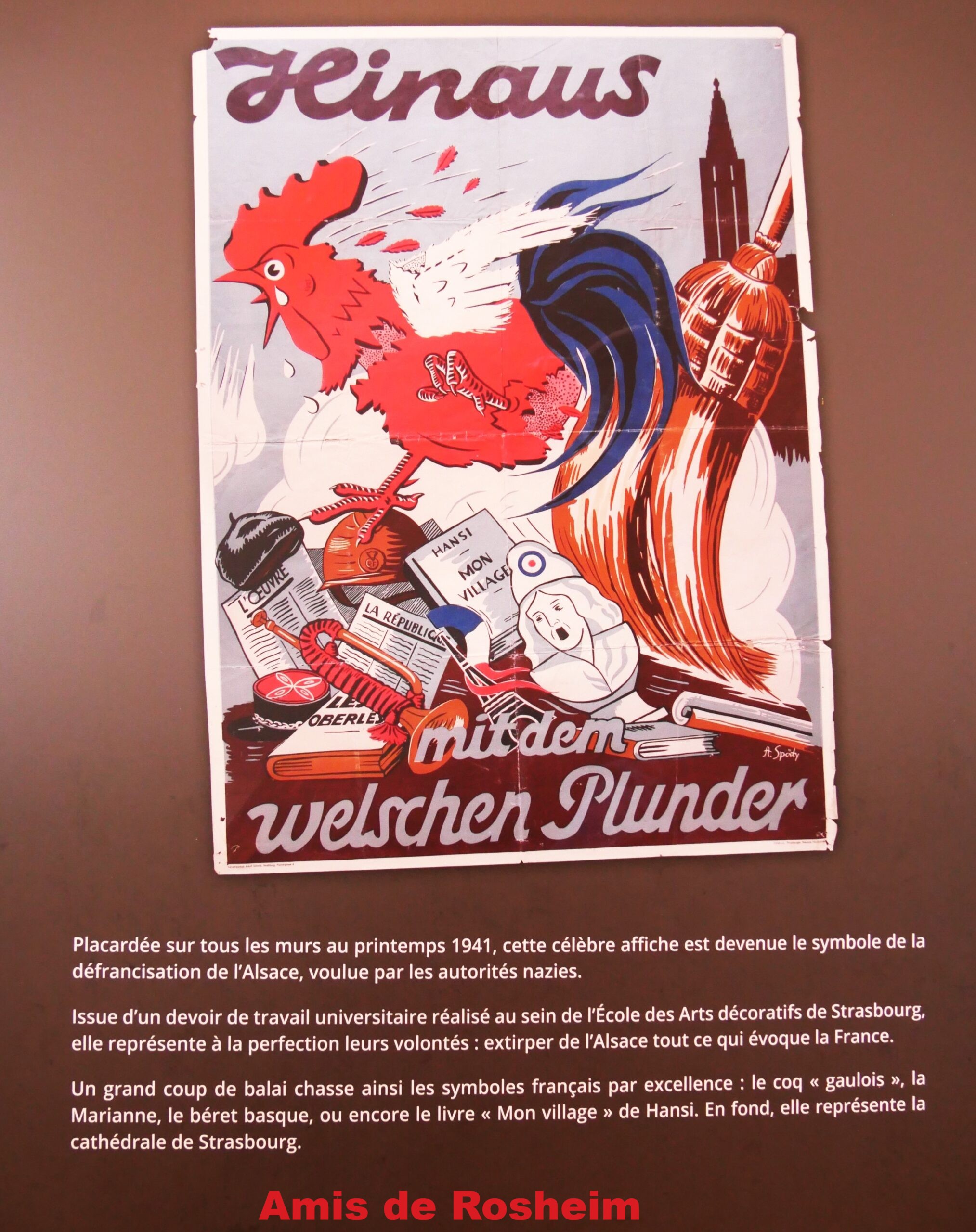 2 – Placardée sur tous les murs au printemps 1941, cette célèbre affiche est devenue le symbole de la défrancisation de l’Alsace, voulue par les autorités nazies. Un grand coup de balai chasse ainsi les symboles français par excellence : le coq « gaulois », la Marianne, le béret basque, ou encore le livre « Mon village » de Hansi. En fond, elle représente la cathédrale de Strasbourg.