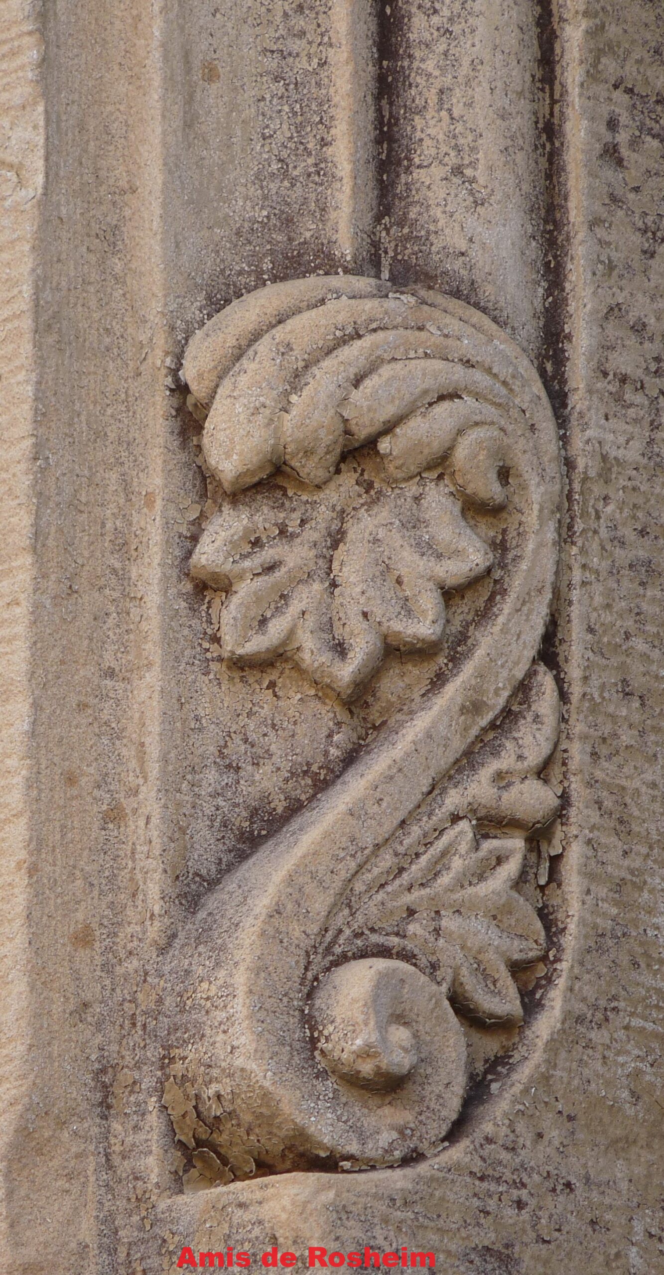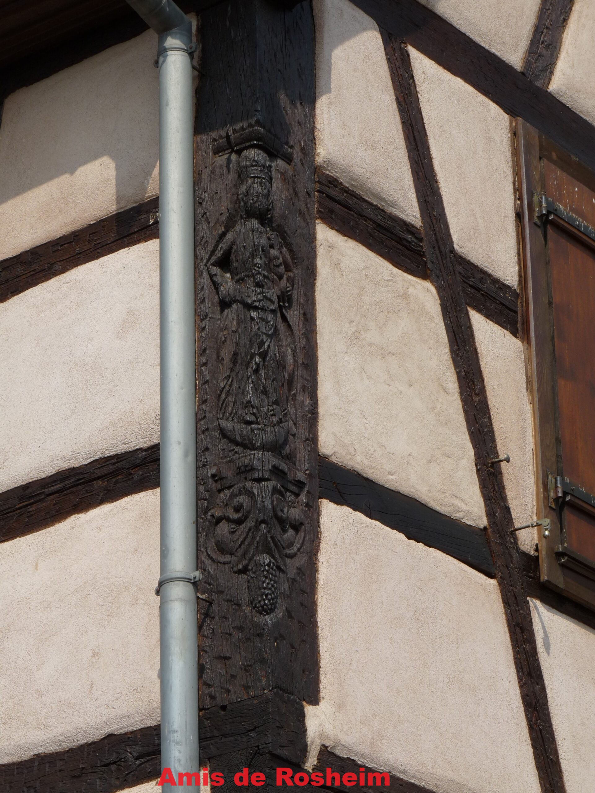 4 – Lors des travaux de réhabilitation, pendant lesquels les anciens crépis furent enlevés, on découvrit sur le poteau cornier sud-est cette belle sculpture représentant une Vierge à l’Enfant, avec la lune sous les pieds. Sous le piédestal est sculptée une grappe de raisin.