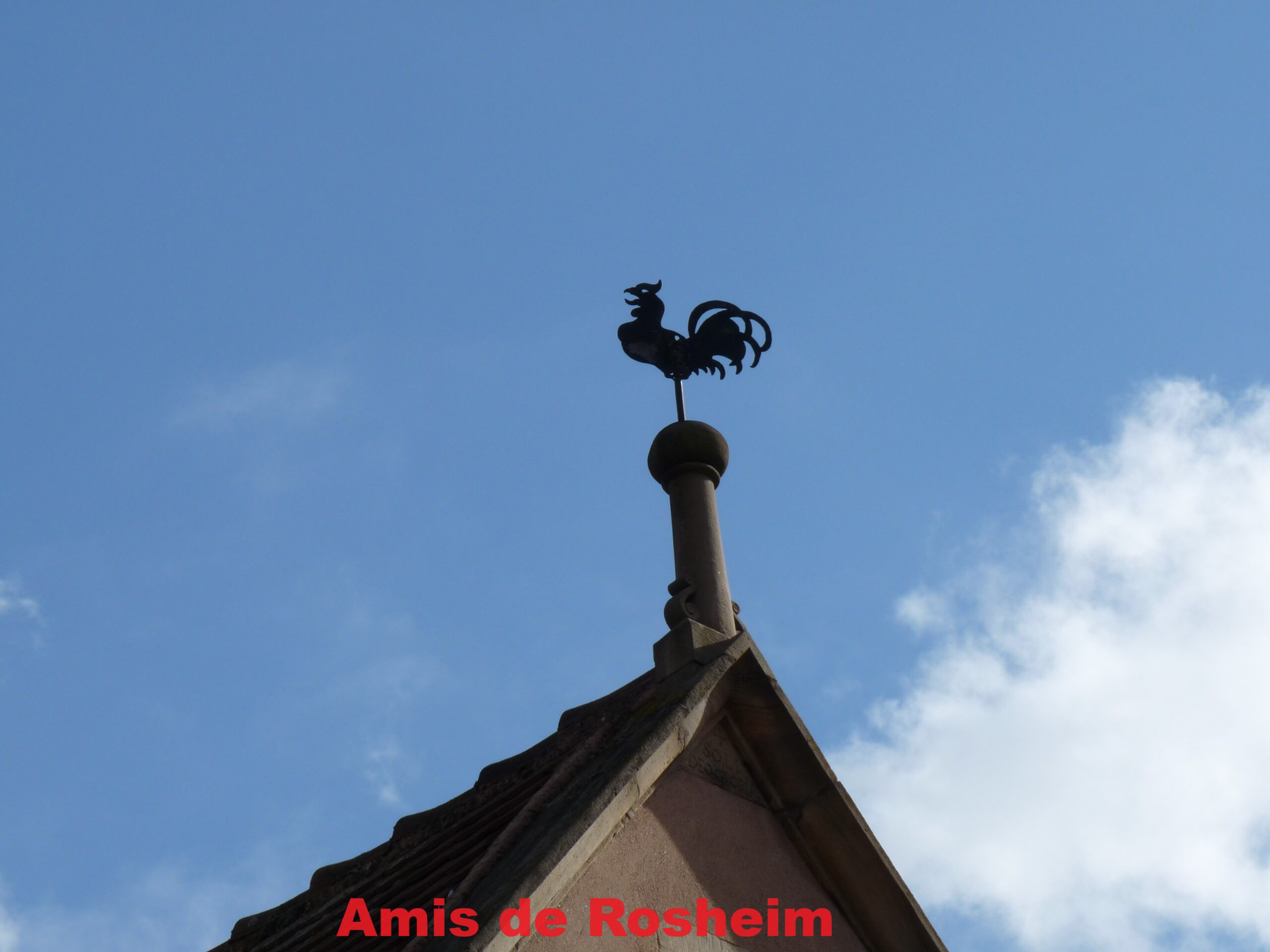7 – Le sommet du pignon du n° 6 porte une girouette en forme de coq, au-dessus de la devise gravée dans la pierre « + SOLI DEO GLO-RIA (+ À Dieu seul la gloire) ».